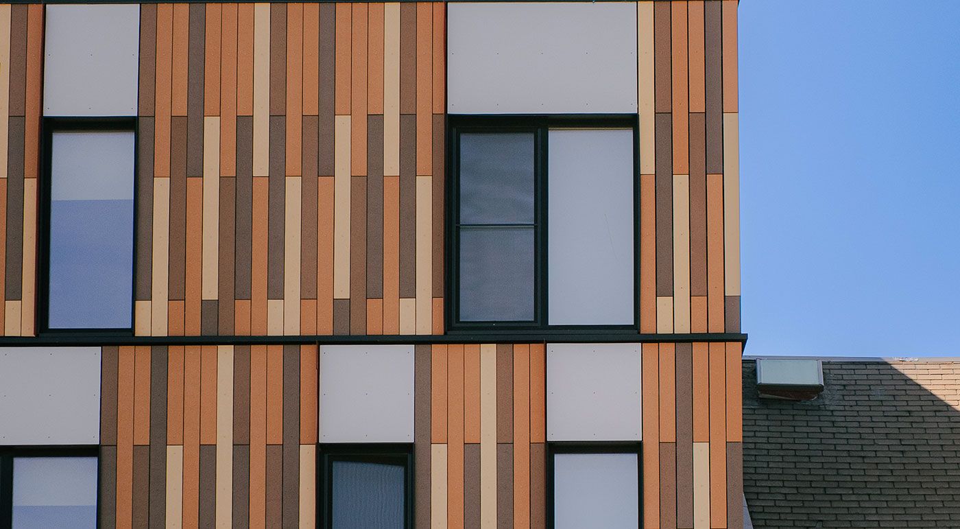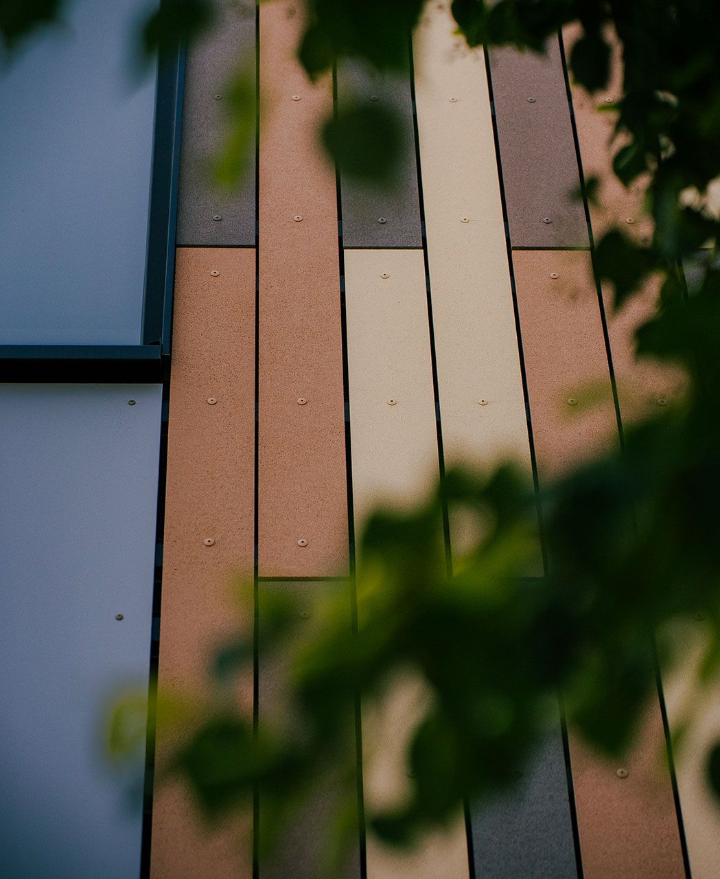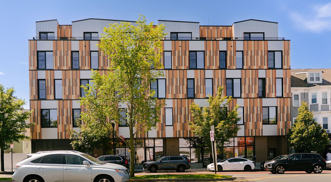 154 Broadway est un bâtiment polyvalent de cinq étages à Somerville, accueillant à la fois des espaces commerciaux et des appartements locatifs. De grandes vitrines au rez-de-chaussée ouvrent les commerces et les halls résidentiels sur l’espace public, tandis que les étages supérieurs présentent des lames de façade ventilée Rieder et des variations subtiles de couleur, créant un jeu de lumière et d’ombre. La façade raconte l’histoire du quartier : une mosaïque vivante de couleurs, matériaux et textures, avec des teintes et motifs rythmiques variés qui ajoutent profondeur et dynamisme.