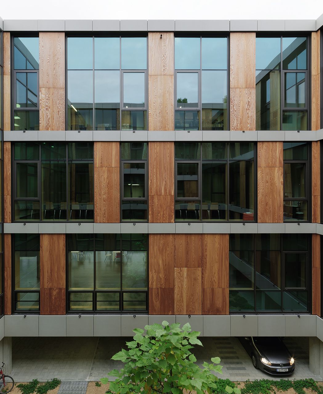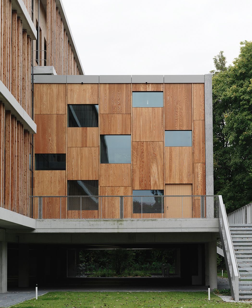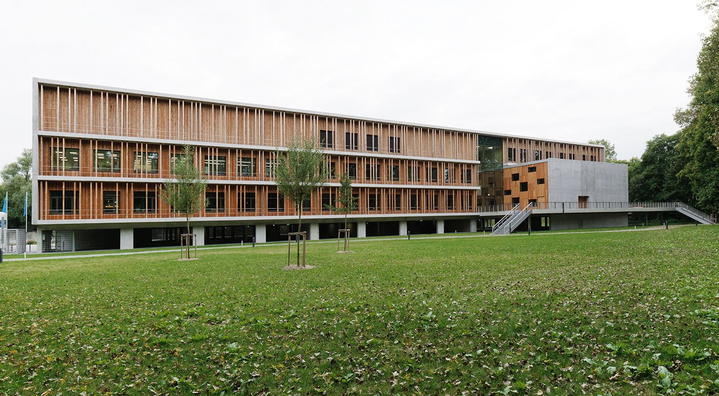 Ce nouveau bâtiment destiné à la chimie durable agrandit le centre scientifique du Campus de Straubing et constitue la limite nord du quartier. Ce complexe de trois étages, étiré en longueur, abrite des auditoriums, des salles de séminaires, de bureaux et de réunions, des laboratoires et une cafétéria. Le hall d’entrée constitue le centre de communication et divise le bâtiment en une aile ouest et une aile est. Le bois et le béton sont les matériaux dominants de sa façade. En plus d’une structure à cadres de bois et de béton isolant, des pièces moulées en béton aux fibres de verre ont été utilisées. Les éléments en forme de L donnent à l’enveloppe extérieure un aspect monolithique. En combinaison avec le bois, ceci crée un contraste intéressant et un mix de matériaux. Photos: Ditz Fejer