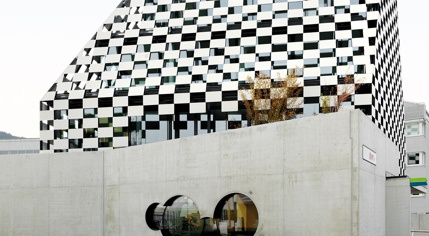 Sur le Mitterweg à Innsbruck, on rencontre des bâtiments très hétérogènes. En réaction à cet environnement plutôt triste, il était important pour l’architecte Rainer Köberl de créer une contrepartie conviviale. Le corps du bâtiment est dominé par la forme prononcée d’une pyramide tronquée étirée en hauteur, et par la façade en fibrobéton conçue en un contraste de caractère ouvert et de caractère fermé, ou encore de légèreté et de lourdeur. Photos : Ditz Fejer