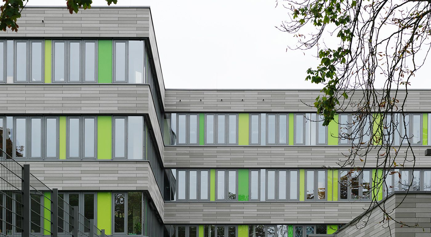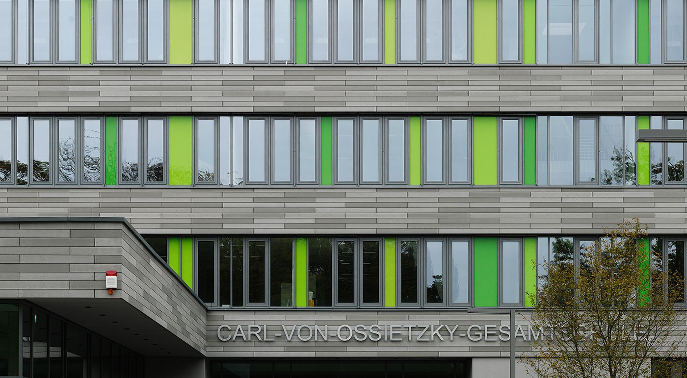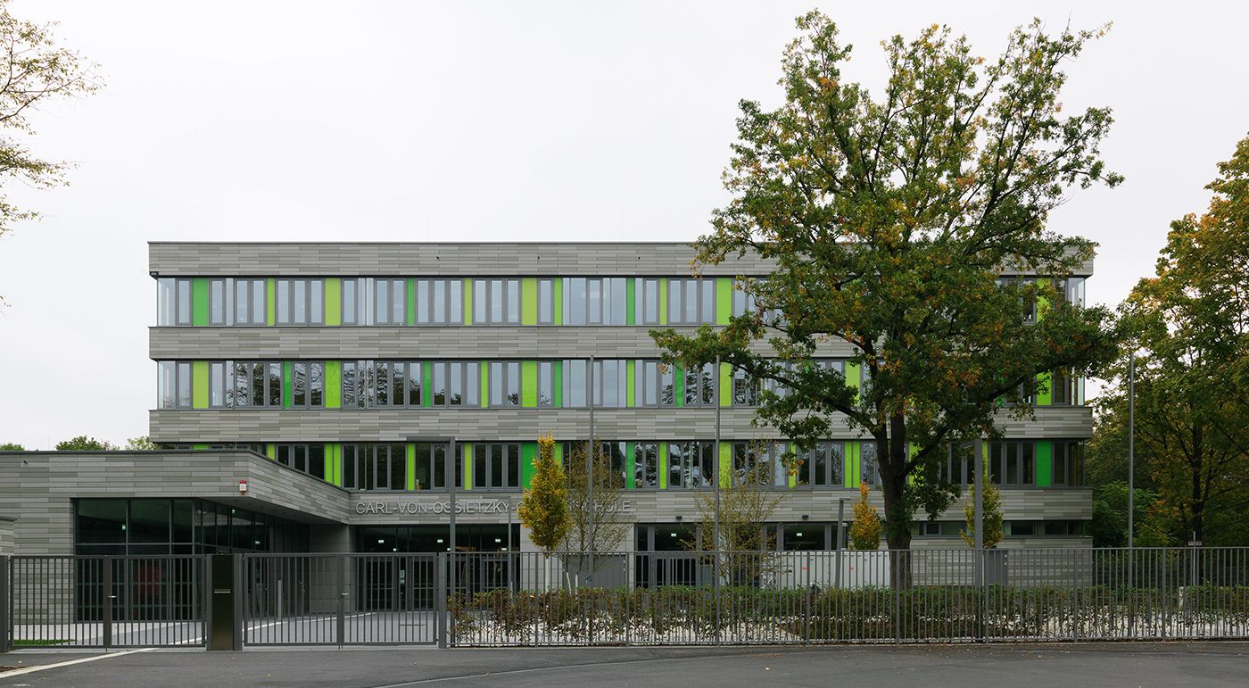 Le nouveau bâtiment du collège Carl-von-Ossietzky se divise en trois grands volumes carrés qui se recouvrent mutuellement aux coins. Le corps de bâtiments complexe est imbriqué avec le paysage environnant. De nombreux arbres parsèment le complexe scolaire et les fenêtres ont donc aussi été soulignées en différents tons de vert. Des façades homogènes divisées horizontalement rassemblent les diverses zones en un tout harmonieux. L’enveloppe du bâtiment a été conçue sous forme d’une façade ventilée suspendue avec des lattes en béton aux fibres de verre en silvergrey. L’utilisation de trois surfaces différentes donne au bâtiment son aspect vivant.