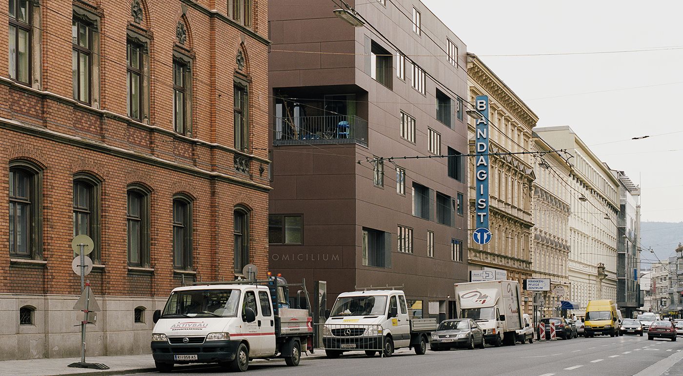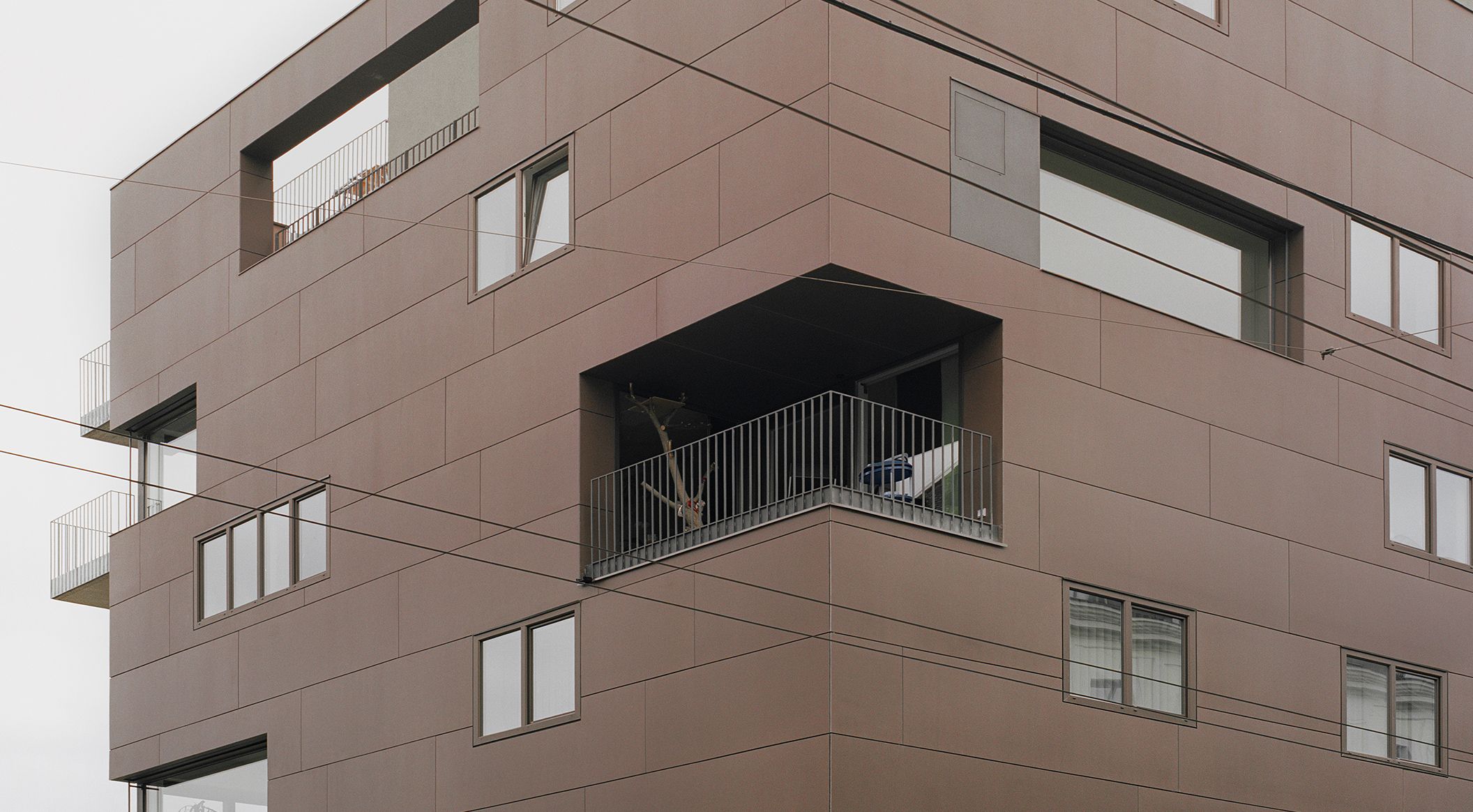 Le bâtiment mixte de bureaux et de logements a été revêtu de plaques en concrete skin de couleur terra. La nouvelle enveloppe du bâtiment s'intègre harmonieusement dans l'existant. Photos: Rasmus Norlander