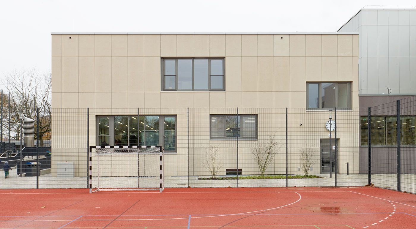 La façade crée une unité visuelle entre le gymnase, les bâtiments existants et la nouvelle extension grâce à un choix cohérent de matériaux et de couleurs. Les panneaux concrete skin dans les tons sahara et ebony apportent des touches distinctives et s’intègrent subtilement dans la palette chromatique. Pendant la période de travaux, l’ensemble des activités scolaires a été temporairement transféré dans une structure modulaire située à environ 800 mètres, qui est désormais utilisée par d’autres établissements scolaires. Photos : Ditz Fejer