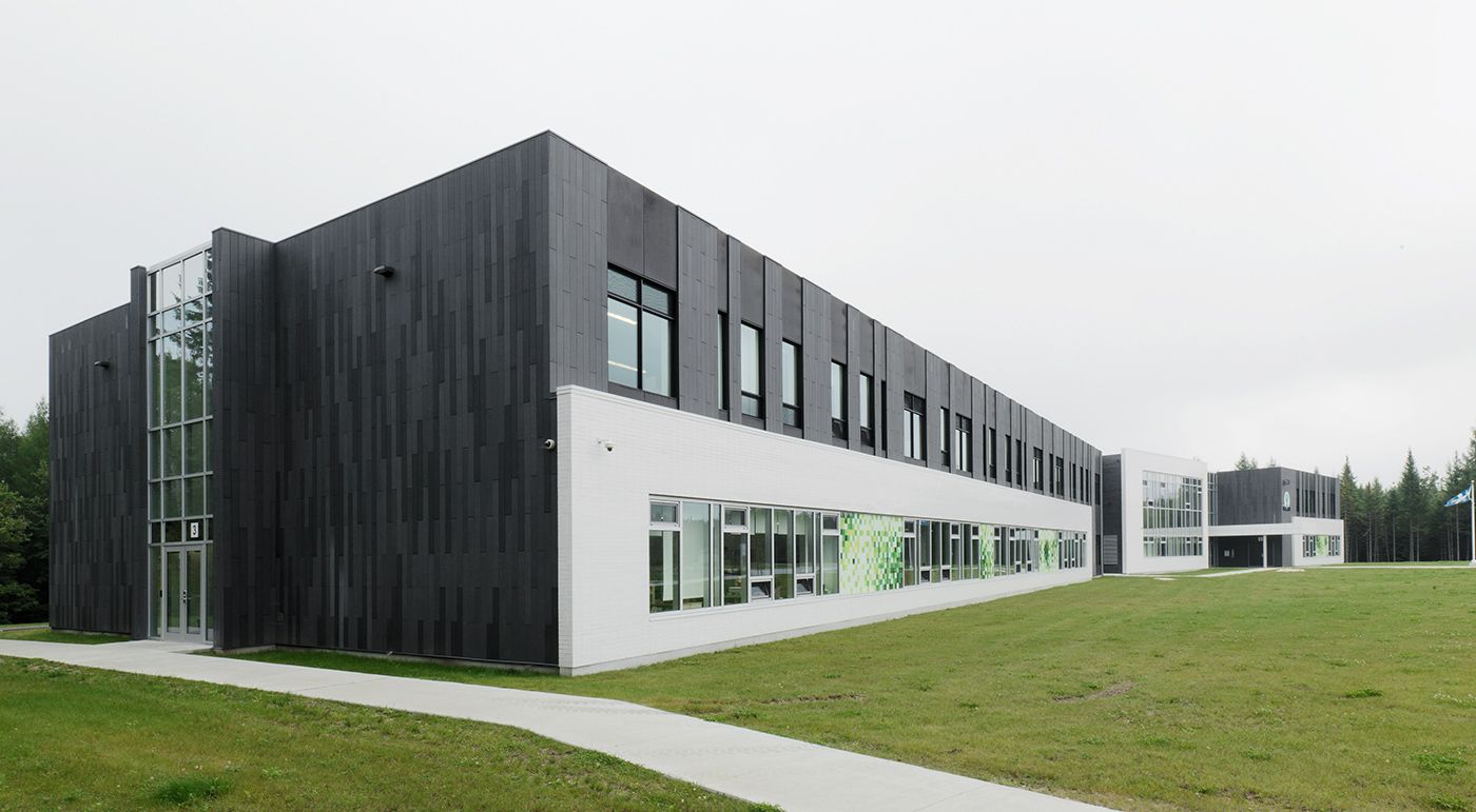 La nouvelle école primaire de Sainte-Catherine-de-la-Jacques-Cartier peut accueillir 550 enfants. L’ouvrage est constitué de deux corps de bâtiment rectangulaires, séparés par un hall d’entrée central. Photos : Ditz Fejer