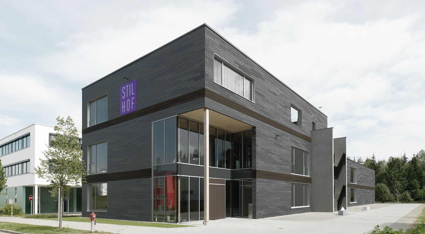Le Stilhof à Brunnthal laisse le champ libre à l’imagination et aux particularités. La façade grise en öko skin enveloppe la surface d’exposition de 1800 m² dans la banlieue de Munich. En combinaison avec le bois, le bâtiment se détache nettement des bâtiments commerciaux environnants. Photos : Ditz Fejer