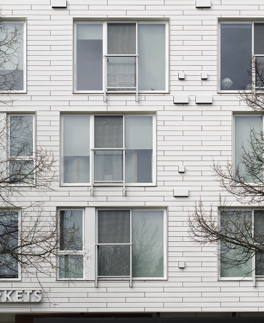 Lors de la conception de ce complexe à usage mixte, on a repensé les méthodes traditionnelles pour créer une expérience toute nouvelle. Le bâtiment a été harmonieusement intégré par les architectes dans le contexte de la région et attache une grande valeur à l’air frais et à la lumière solaire. Des allées végétalisées et de grandes surfaces de fenêtres renforcent sa convivialité. La façade a été habillée de lattes d’öko skin en polar white, chrome et liquid black. Les différentes tons de gris donnent à l’enveloppe du bâtiment plus de dynamisme et de profondeur. Photos: Ditz Fejer