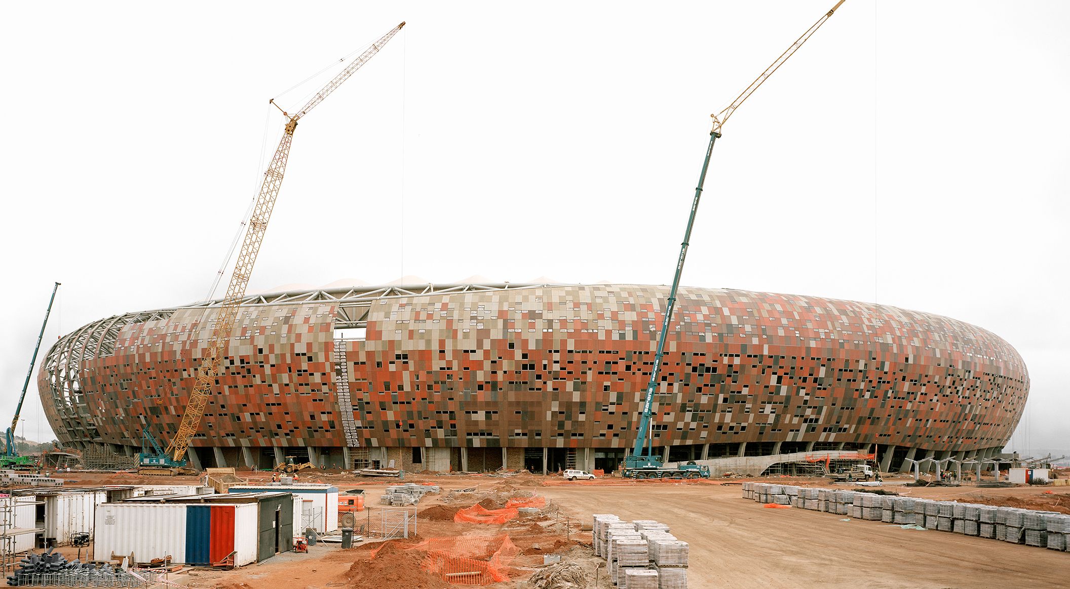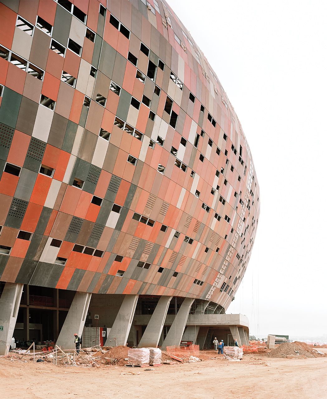 Thanks to its imposing appearance, the Soccer City Stadium in Johannesburg has quickly emerged as the landmark of the 2010 FIFA World Cup. The 2010 FIFA World Cup was to become an “African” World Cup, showcasing the flair and culture of the continent. Therefore, the design of the stadium also incorporates many elements of Africa. For over a year, Rieder was involved in the realization of the World Cup site in Johannesburg. 40,000 glassfibre reinforced concrete panels in various African colors were delivered to South Africa, further processed in the purpose-built field factory, and installed in the largest stadium in Africa. During this period, all subtasks, such as cutting, packaging, manufacturing of fastening profiles, seals, etc., were implemented and the installation of the components carried out. On site in South Africa, the required frame modules could be assembled just in time. The steel elements were simply fitted together by local workers. Each module had its own blueprint. The mounting frames and panel elements were developed independently and manufactured at the production site in Germany, but provided to the customer as an integrated unit by the on-site factory. Photos: Rasmus Norlander