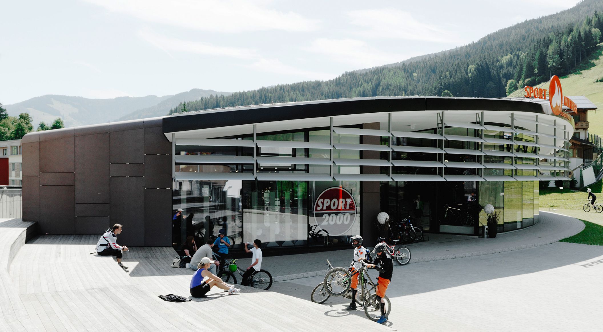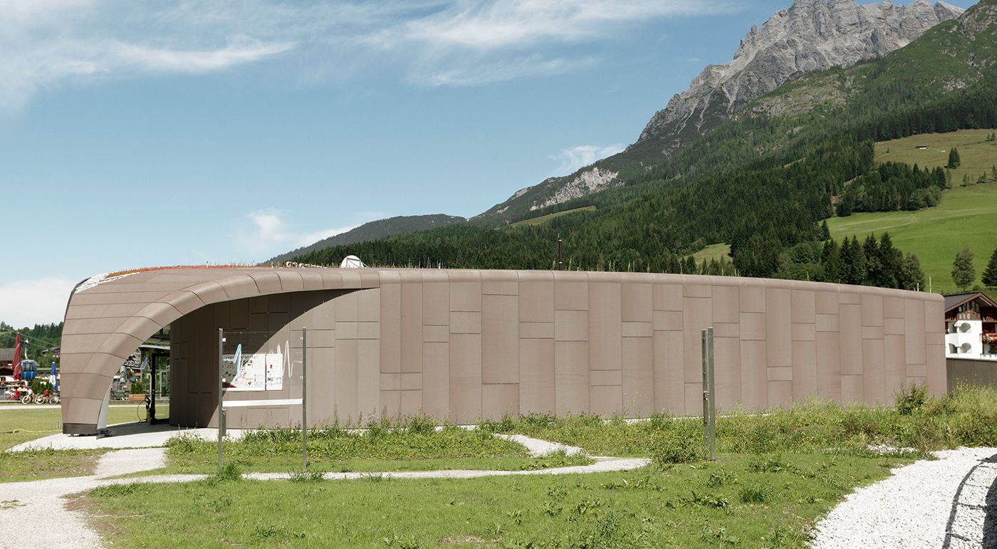 Le magasin de sport du Leogang a été habillé de grandes plaques de voile de béton de couleur terra. Le bâtiment incurvé couleur de terre naturelle s’intègre harmonieusement dans les coulisses du Steinberg. Photos: Ditz Fejer