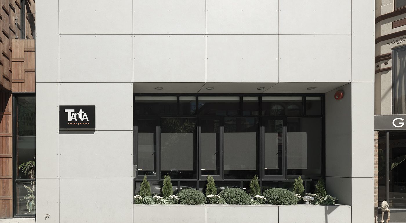 Les architectes d’ESYN Design ont planifié le restaurant péruvien. La terrasse sur le toit, ouverte toute l’année, est particulièrement réussie. Les architectes ont utilisé des panneaux de revêtement en béton silvergrey pour la façade.