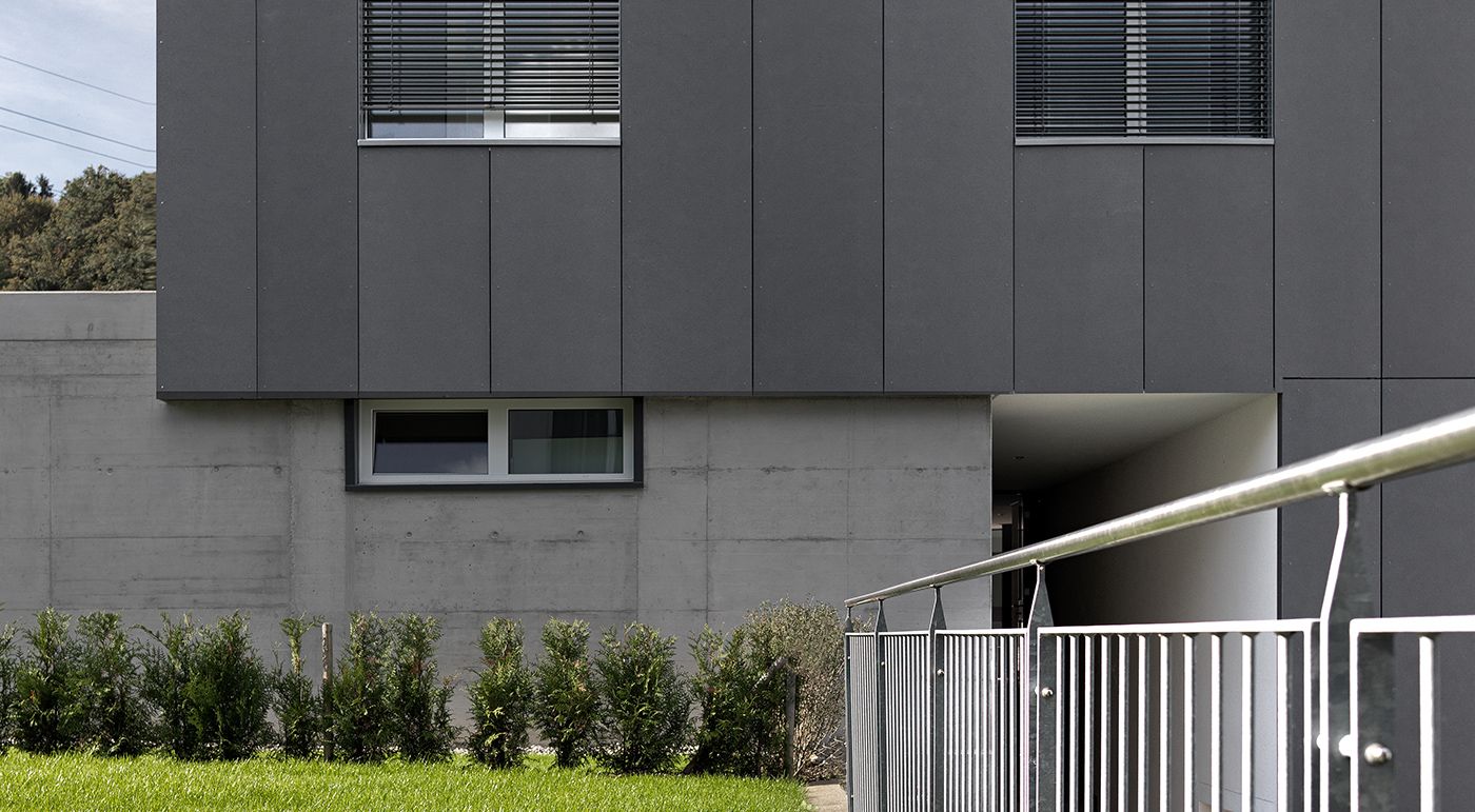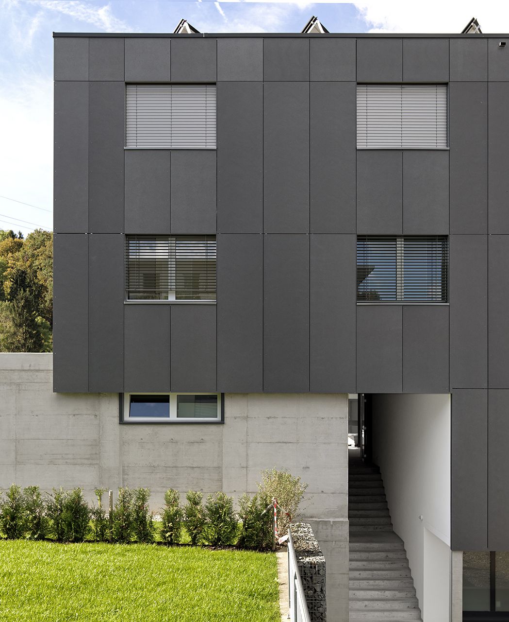 La façade a été revêtue de plaques en voile de béton en différents tons de gris. Les produits de Rieder ont séduit les architectes grâce a leur durabilité, leurs faibles contraintes d’entretien et leur résistance absolue à l’incendie. Photos: Clemens Natsis
