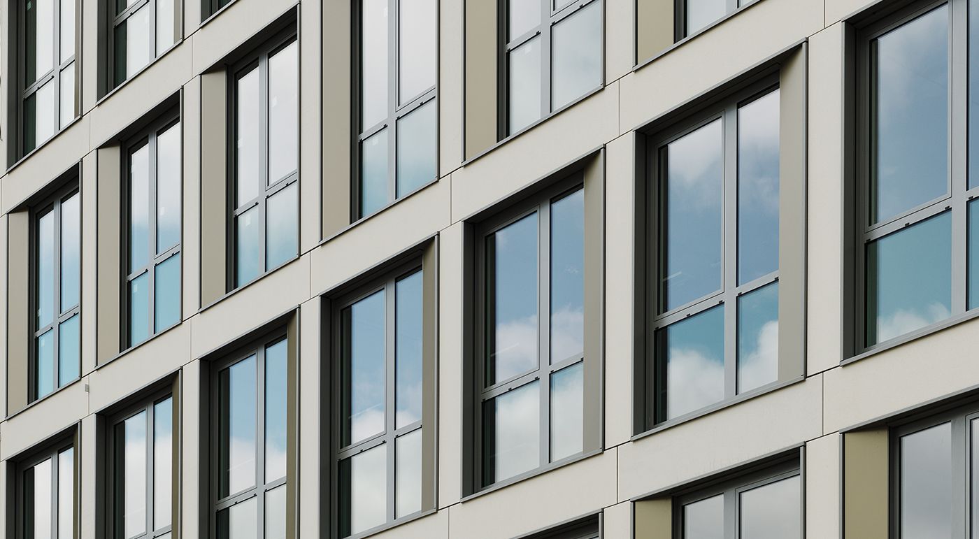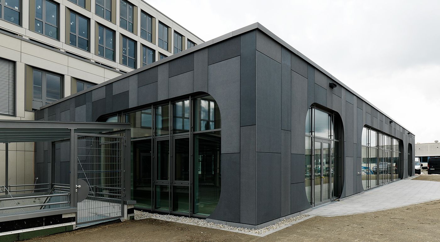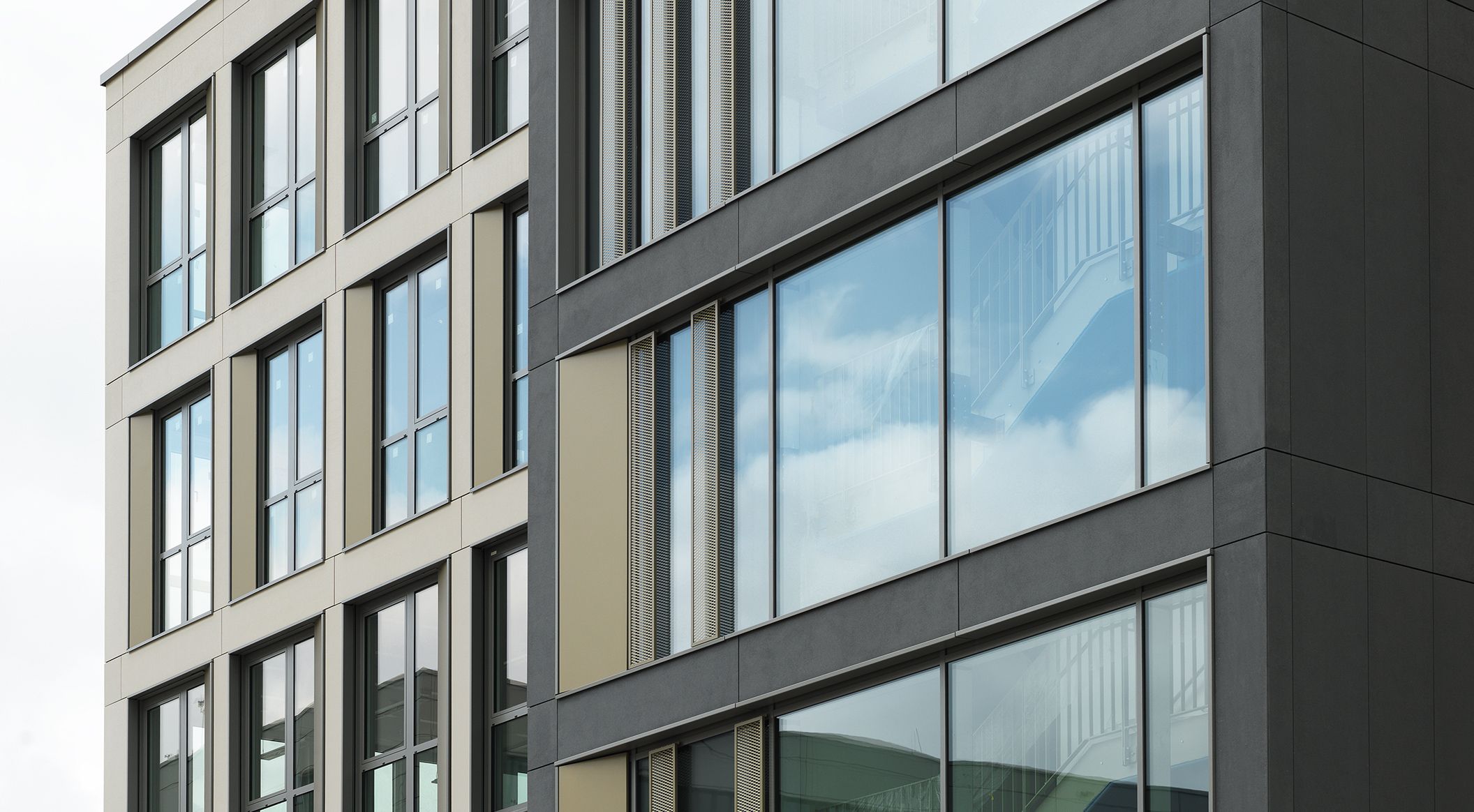 Le développement durable a également été le souci des architectes lors de la conception des nouveaux bâtiments. Des friches urbaines sont revitalisées, des normes d’énergie au goût du jour et des concepts immobiliers durables sont mis en œuvre. Pour s’adapter au concept écologique, le premier immeuble de bureaux a été habillé de plaques de concrete skin en liquid black et sahara. Outre le contraste en clair-obscur, la façade apporte une autre touche avec sa texture en luce silver : grâce a un additif pailleté, l’enveloppe du bâtiment devient scintillante et luisante. En fonction de l’incidence du soleil, les particules se reflètent différemment et créent des effets originaux. Photos: Ditz Fejer