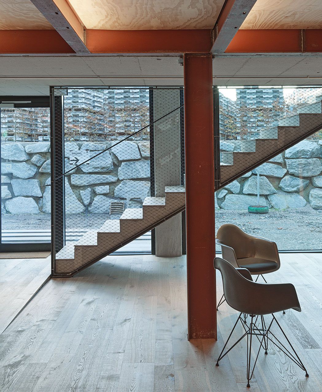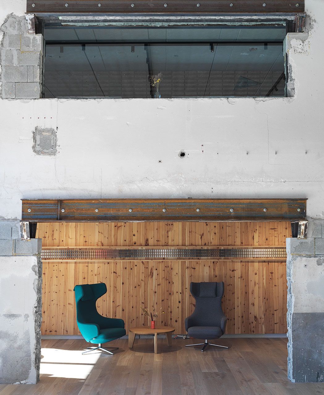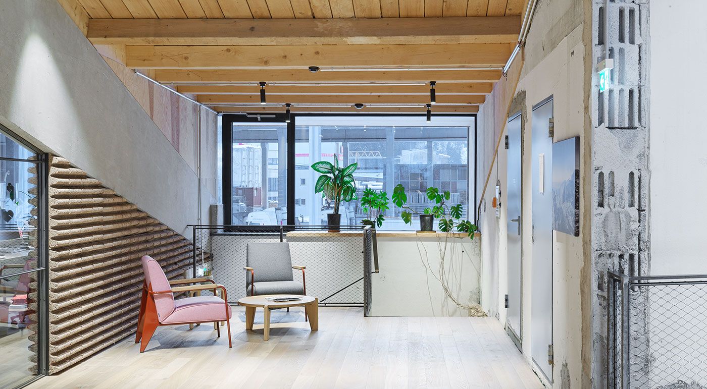 Many materials were reused during the renovation: an I beam from 1958, 150 tons of recycled steel beams, tiles from the old wash hall, used furniture, flooring, grass pavers, and a wall cladding made of Swiss pine. Combining these with high-quality new materials creates a deliberate contrast—a powerful statement for circular construction with identity. The concept is rounded out with a pellet heating system, photovoltaic installation, efficient LED lighting, an e mobility concept, use of wood, and low CO₂ glass fibre reinforced concrete facade panels.