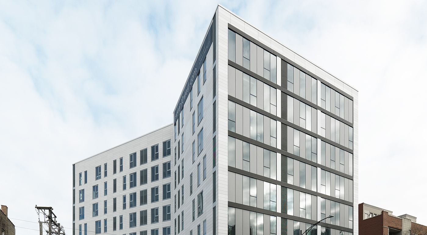 710 West Grand comprises 105 rental apartments, 5,000 square metres of retail space and 45 parking spaces. The building is located on a triangular plot of land that contrasts with Chicago’s traditional rectangular grid of blocks, which projects usually have to adhere to. The apartment building has two rectangular elements which are connected at a 30-degree angle, giving it a curvy shape. Photos: Ditz Fejer