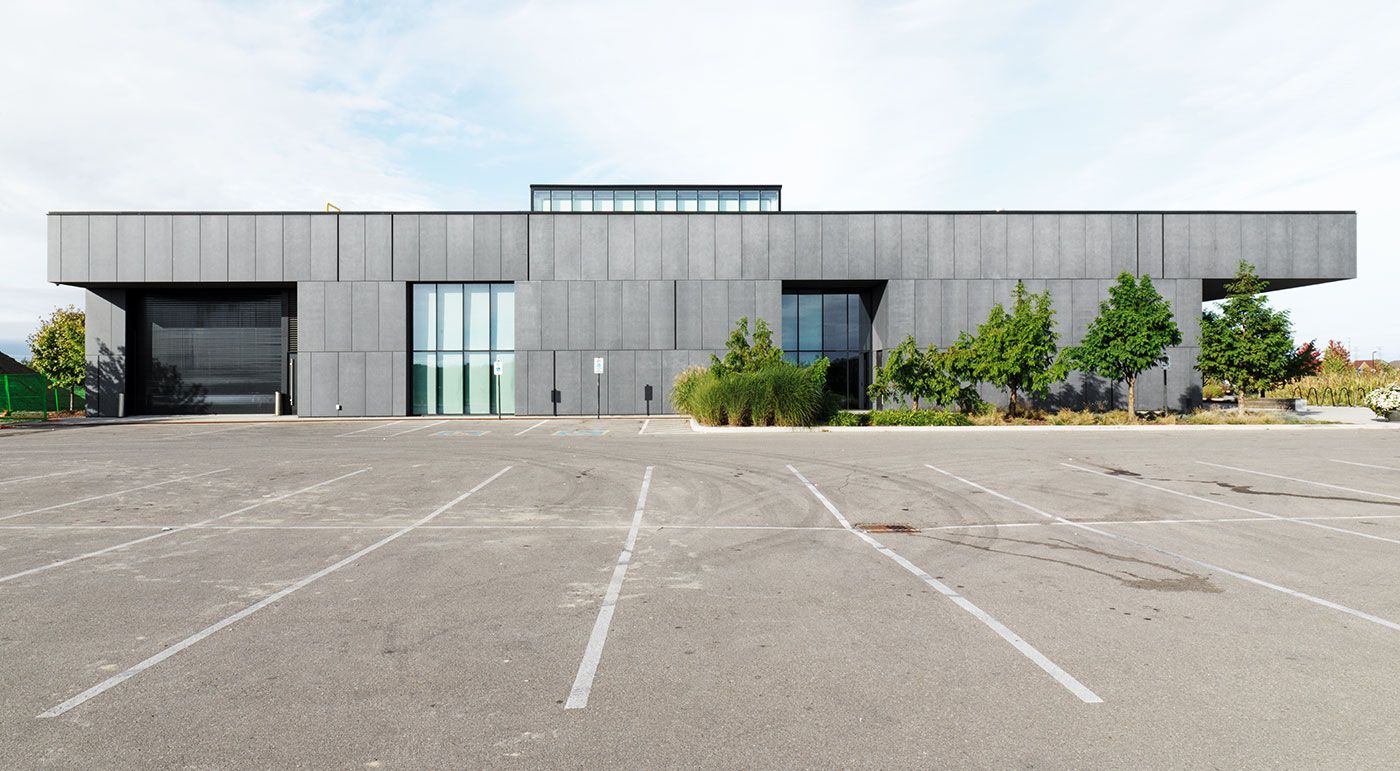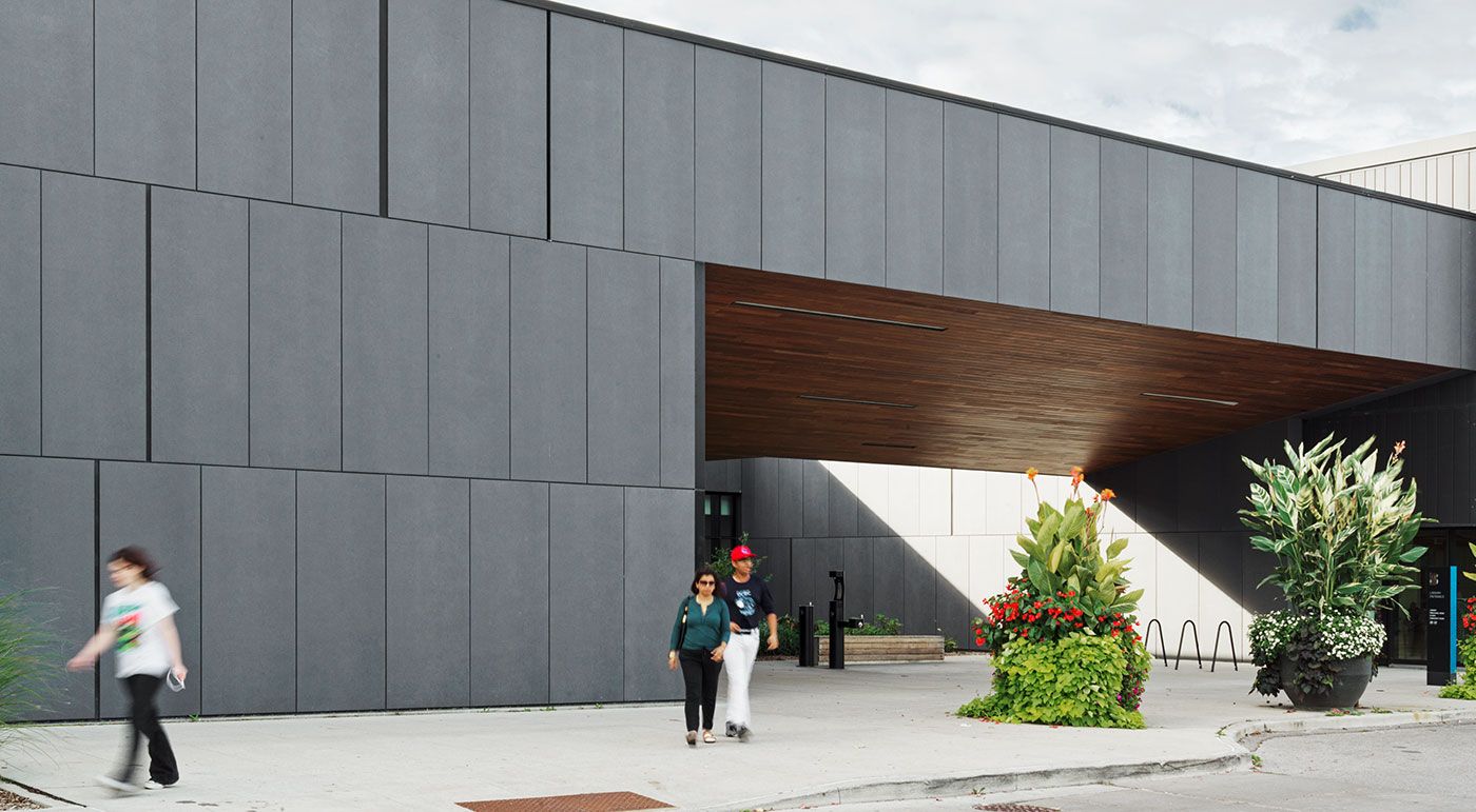 The Audley Recreation Center features a community center, an indoor pool, a sports hall, administrative offices, a fitness center, and more. The center serves as a model for integrating public facilities into the residential and street network of Ajax’s suburbs. This LEED Gold-certified project focuses on sustainable construction. In the second phase of construction, a public library was added. The façade of the Audley Branch Library was clad in concrete skin panels in liquid black. Photos: Ditz Fejer