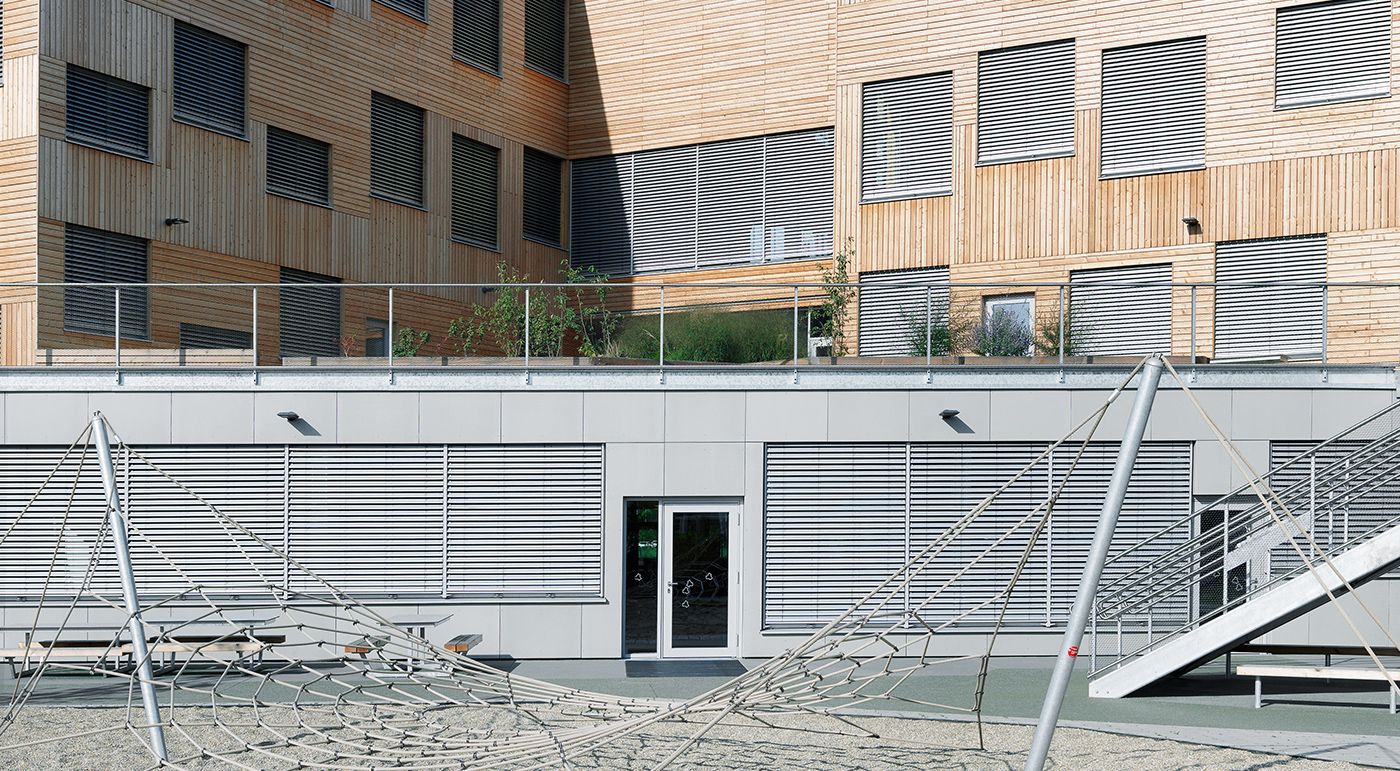 For years, the City of Vienna has been making use of the concept of a common school campus, a central location for various facilities. The educational campus in Hirschstetten is home to a kindergarten, a primary school and a secondary school for a total of 1,100 children. In addition, more than 11,000 m² of open space is available to the students. The campus designed by PSLA is a complex construct with the basic layout being bent several times. The facade consists mainly of untreated larch wood. More than 1,000 m² of concrete skin glassfibre reinforced concrete panels were used for the plinth area. These harmonize perfectly with the wood above. Photos: Ditz Fejer