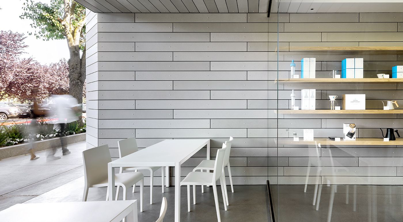 This urban, minimalist oasis emphasizes the combination of different materials. The new café features ivory öko skin slats for both the interior and exterior areas. The subdued colors visually highlight the volume of the space and are harmoniously blended into the overall look. Photos: Adam Rouse