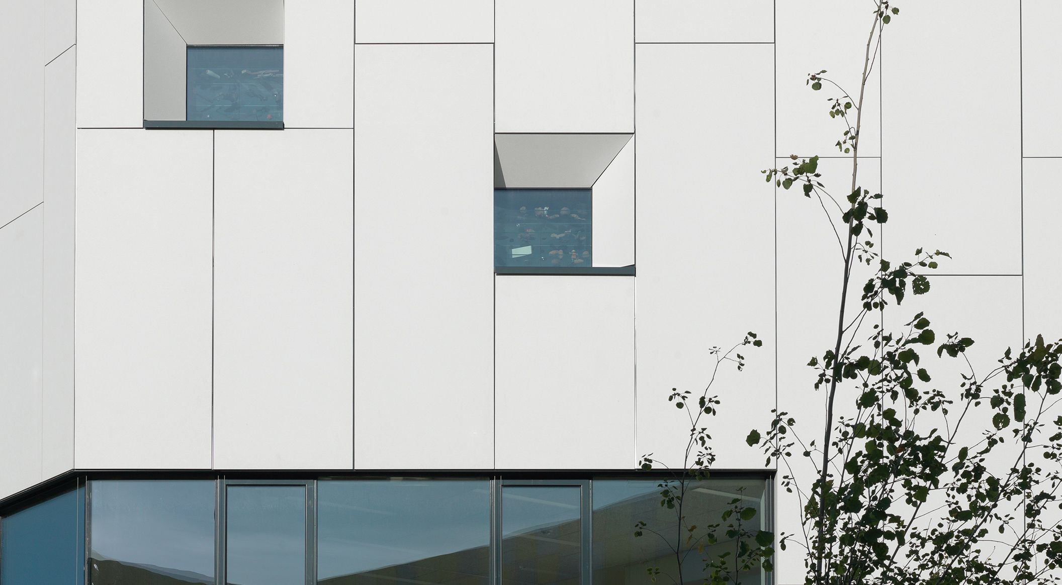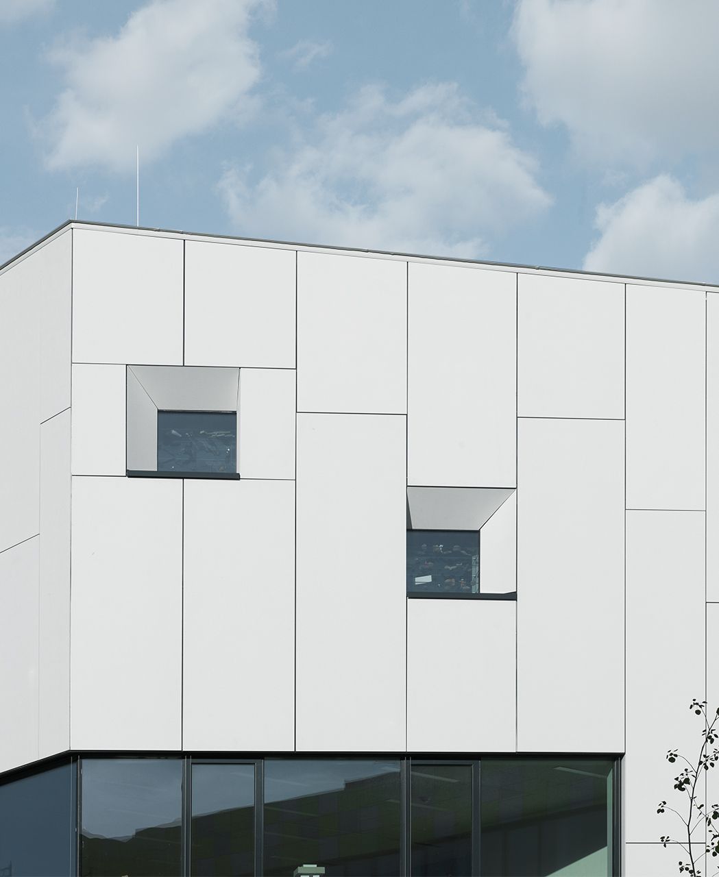 The federal school center in Bruck an der Leitha was renovated. The architects at Treberspurg & Partner also planned a creative tower. The modern and energy-efficient building is characterized by a bright and flexible interior. The facade of the new building was clad with concrete skin slats in polar white. Photos: Ditz Fejer