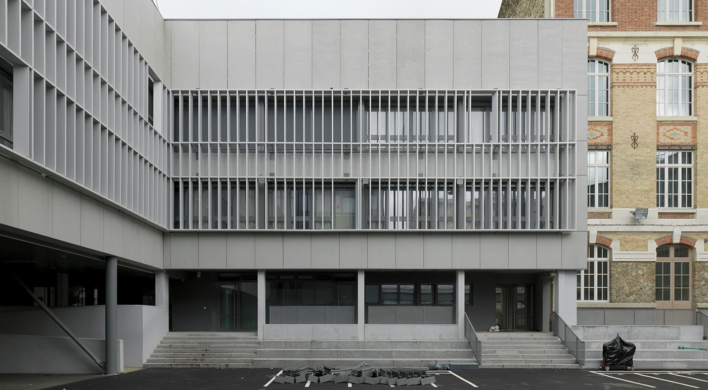 The Cobalt architects restructured and extended the College Claude Chappe and rebuilt a kindergarten. A new building with 6 residential units was also planned. The concrete skin facade panels in the colors ivory and chrome harmoniously integrate into their surroundings. Photos: Ditz Fejer
