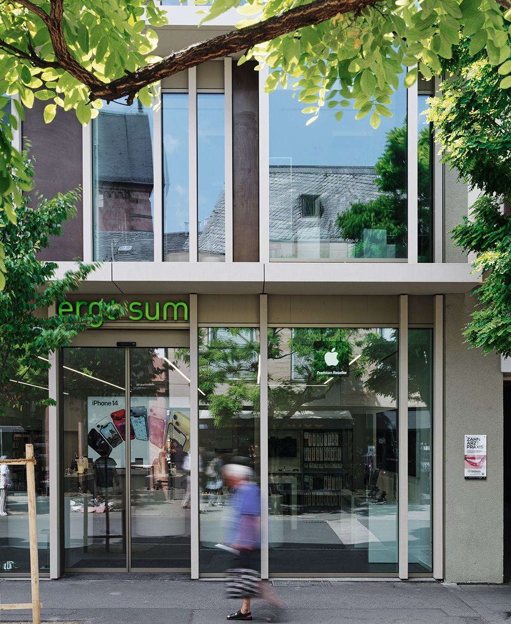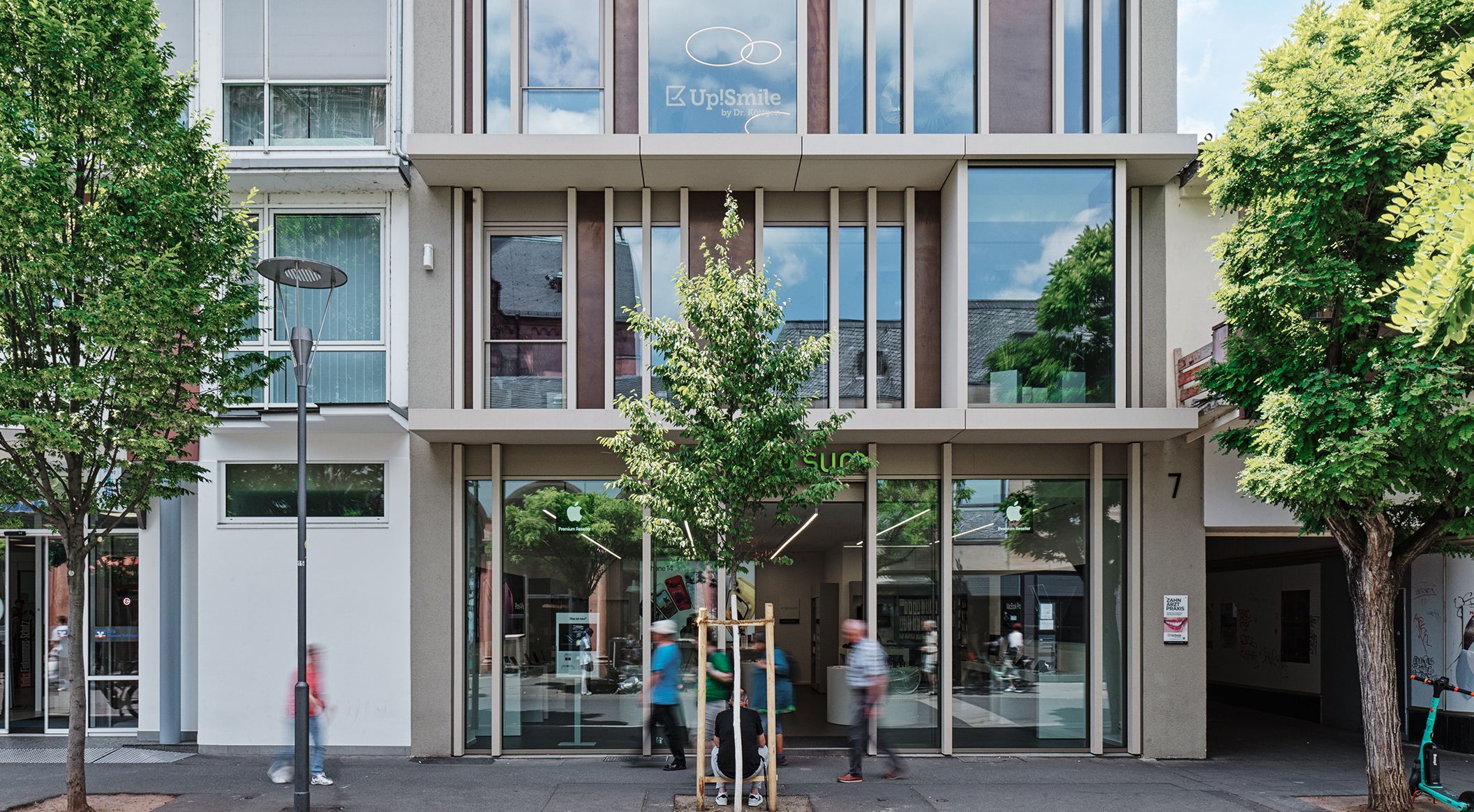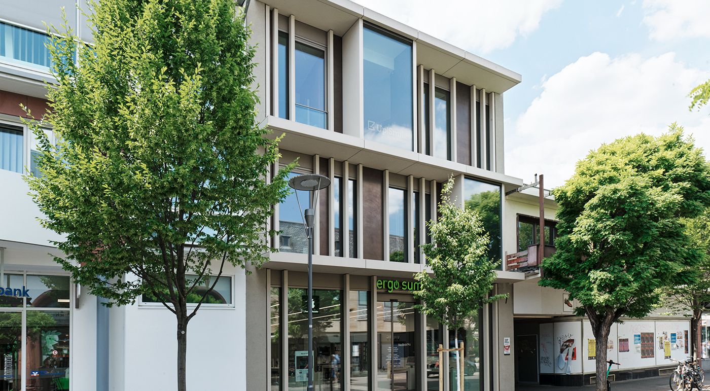 A structural restoration gives the 1950s building on Schöfferstraße a modern facelift. The existing structure was reinterpreted without losing its connection to the neighbouring buildings. The facade bands are a distinctive feature of the post-war buildings in this region. The reference to these structuring elements, the contemporary materiality, and the clear design language establish a visual connection to the surrounding buildings while also making a bold statement for a new zeitgeist. Cantilevered floor slabs echo the characteristic elements of 1950s architecture, which still define the neighbouring building to this day. The glazed exterior is divided by pilaster strips made of glassfibre reinforced concrete. Their look and feel reflects the natural stone of the historic surroundings. Photos: Ditz Fejer