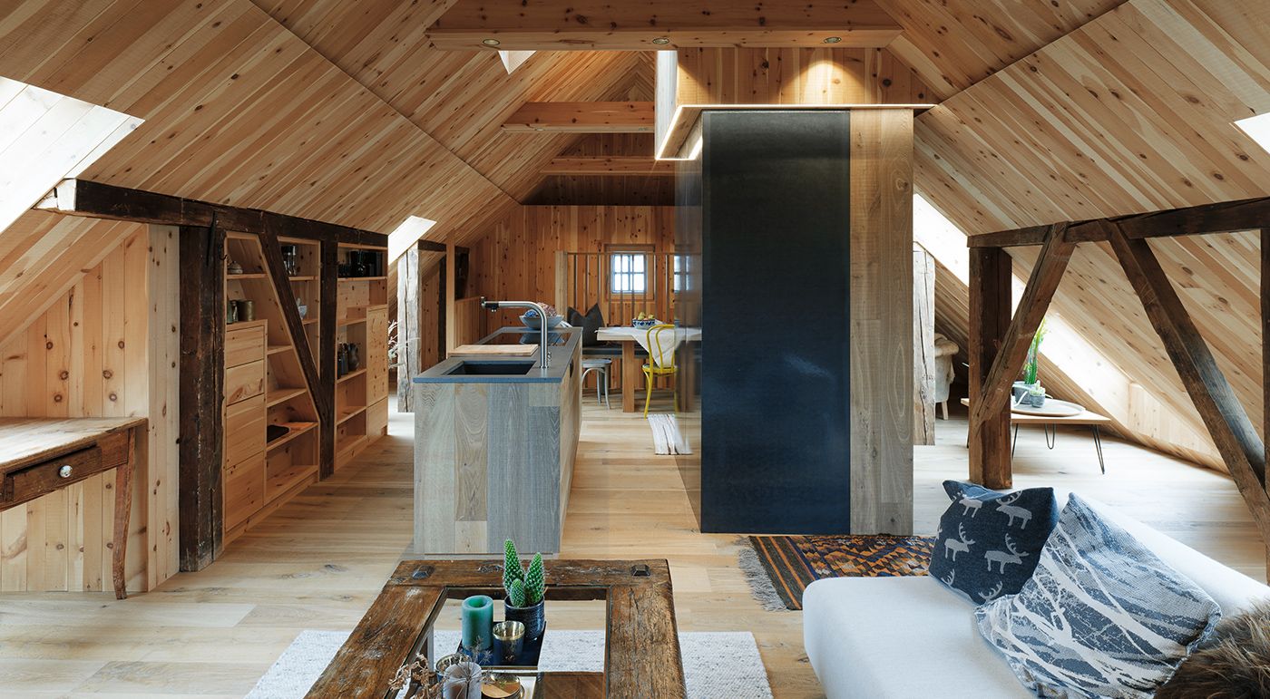 This exceptional apartment in the heart of Pinzgau was renovated with special ecological and architectural considerations in mind. Only high-quality materials and local natural building materials were used. Inside, the mix of materials – wood, concrete, stone and glass – creates a warm and cosy atmosphere. concrete skin panels with a glossy texture were used as wall cladding. The glossy surface makes the room an elegant eye-catcher. The combination of traditional alpine elements with glassfibre reinforced concrete, furniture made of arolla pine wood and loden fabrics lends this holiday home a unique charm. Photos: Ditz Fejer, Peter Eher-Andersen
