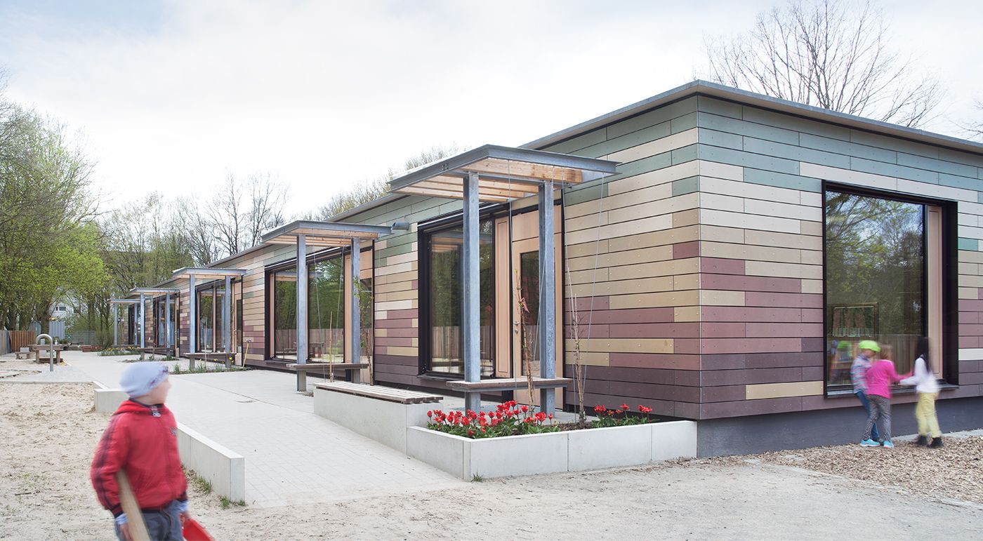 The new outer skin consists of narrow öko skin panels and, with its umbra to green-colored spectrum, fits well into the environment of half-timbered houses and old trees. The day-care center offers four day-care center groups, three of which are full-time groups, for a total of 120 children. Photos: Frank Aussieker