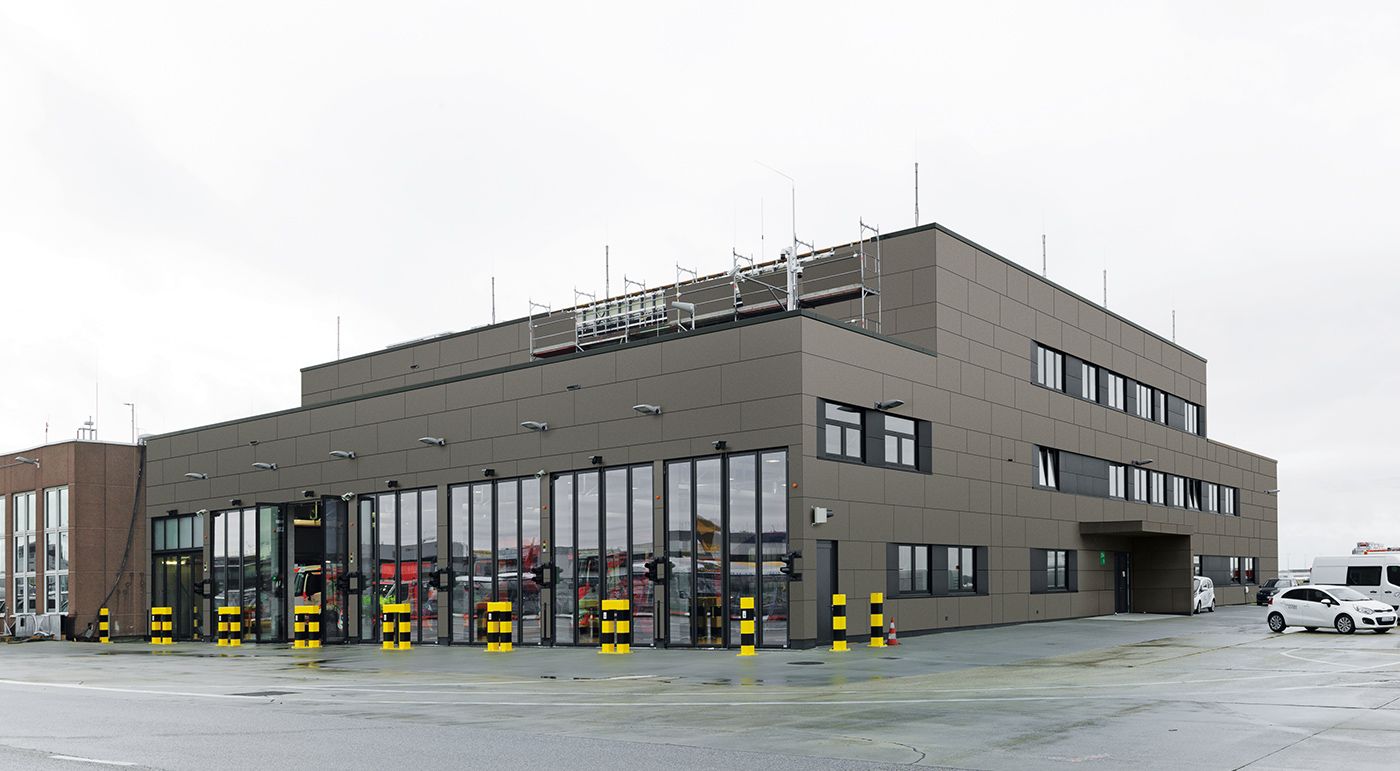 The extension doubles the area of the fire service at Frankfurt Airport fire station 2. The architects at in_design adapted, renovated and modernized the existing complex. The new building houses an additional building fire protection unit. Aircraft fire protection was adapted to meet the latest requirements. The complex is located in the middle of the airport apron, surrounded by runways and aircraft parking positions. The fire station team is on duty around the clock, a fact that was also taken into account in the design of the building. It thus houses not only vehicle halls, administrative rooms, workshops, offices, meeting rooms, quiet areas and training facilities, but also kitchen and dining areas. The vehicle halls have large glazed doors, and horizontal window bands emphasize the movement of the vehicles. concrete skin elements in chrome and liquid black were used for the facade. Glassfibre reinforced concrete ensures absolute safety and fire resistance thanks to its excellent thermal properties, making it the perfect cladding for a fire station. Photos: Ditz Fejer