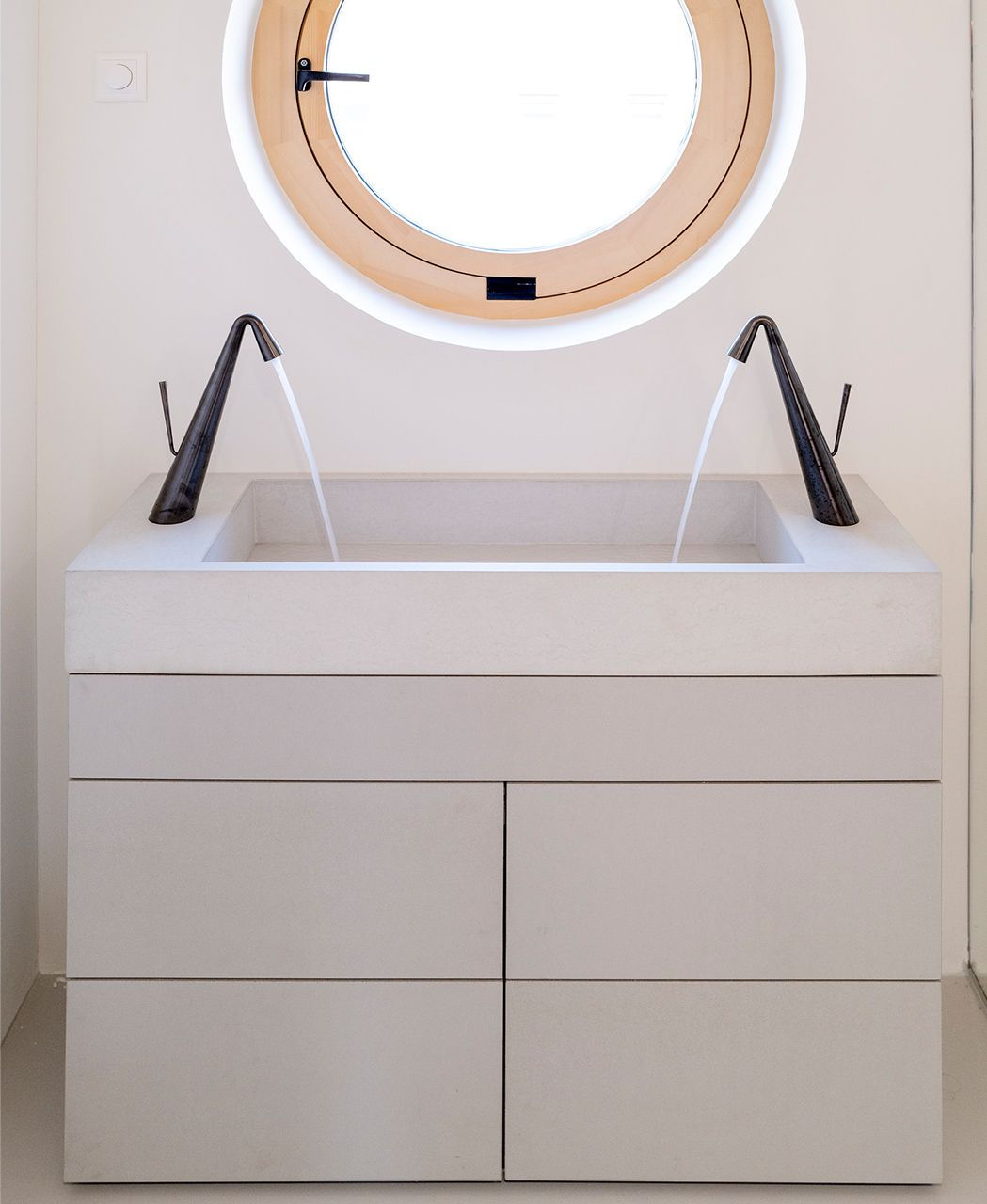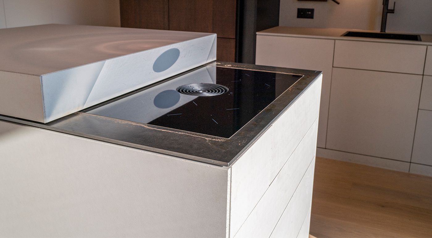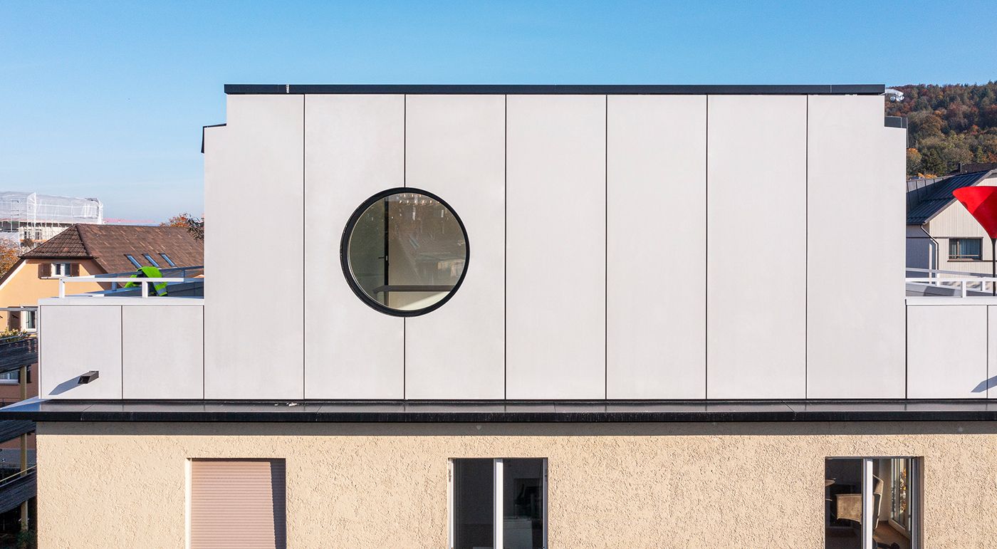 The Swiss private residence G17 was extended. The current green space on the roof was utilized perfectly to create as much living space as possible. This project by dade design created a uniform architecture using a small number of materials. The material focus of the renovation work was on glassfibre reinforced concrete, white cement, oak wood, glass and black matte metal. The material minimalism creates an oasis of calm in juxtaposition to the hectic everyday life of the city. The result was a perfect location for rest and relaxation. Our panels were not just used for the building envelope, but also in the interior. Glassfibre reinforced concrete has a long tradition in interior design and furniture design. The unique concrete pieces impress with their genuine material character and simple elegance, and they are pleasant to the touch. Photos: Dade Design / Jens Ellensohn