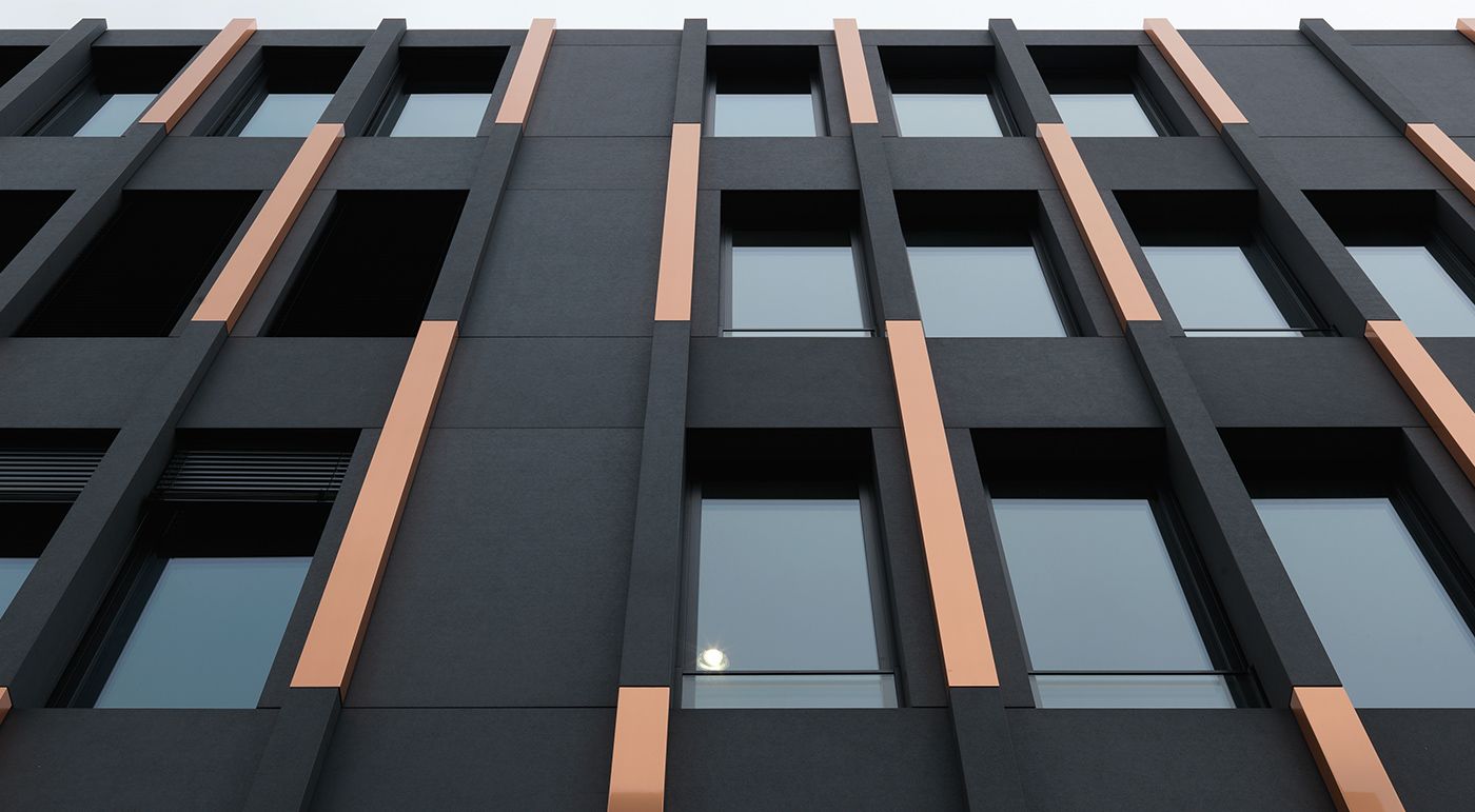 Due to their low weight and large span widths, the sharp-edged formed parts are perfect for facades with challenging geometries. They are assembled from several parts, which lends even more design flexibility to the elements: they are up to seven meters long and come with a wide range of colors, surfaces, textures and combinations. Ultimately, it was the authentic material properties, the flexible design, the straightforward supporting structure and the resulting economic advantages that won over the architects. Photos: Ditz Fejer