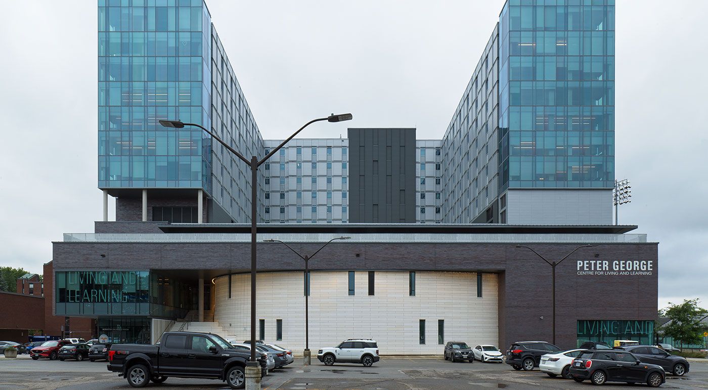 McMaster University expanded its campus with the addition of the Peter George Center for Living and Learning in Hamilton, Canada. The new complex brings together all the essential components a campus community needs: a student residence, dynamic learning spaces, a wellness center, dining facilities, and childcare spaces. The building’s design plays with contrasting forms. On one side, the atrium stands out for its linearity, while on the other, the stacked, circular lecture halls at the center create striking accents. The architects at Diamond & Schmitt used öko skin slats as small-scale elements, arranged in a mosaic-like pattern. The small formats allow the elements to fit seamlessly along the curved lines. Photos: Ditz Fejer