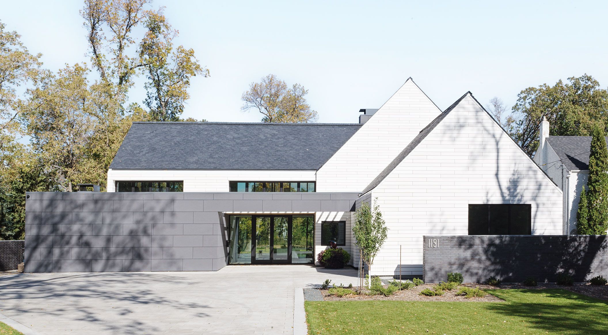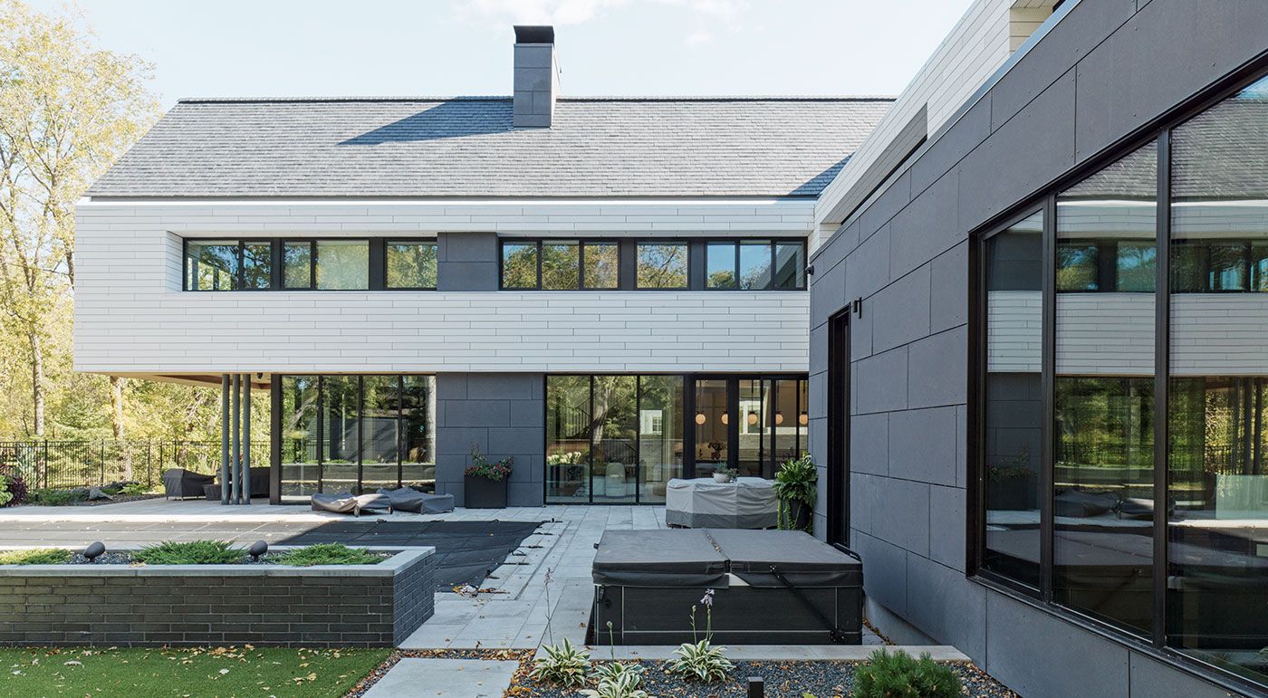 A private residence in Canada features over 800 m² of öko skin slats in polar white. Paired with the dark ground floor and roof, this design achieves a striking contrast across the building’s exterior. The sharply angled roof and large windows add to the home’s unique character. Photos: Ditz Fejer