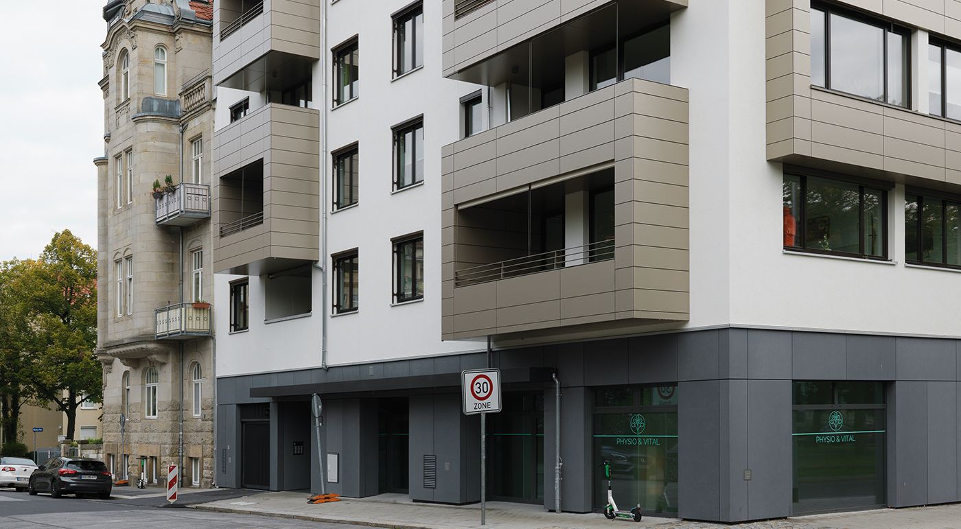 The Münchner Platz in Dresden is characterised by magnificent Wilhelminian-style facades, which lend this district a special charm. The accentuated building envelope of the new “mzwei” residential complex harmoniously blends into the overall picture. concrete skin panels and sharp-edged formparts in anthracite were used for the lower part of the building envelope. The dark elements provide an exciting contrast to the otherwise light facade.