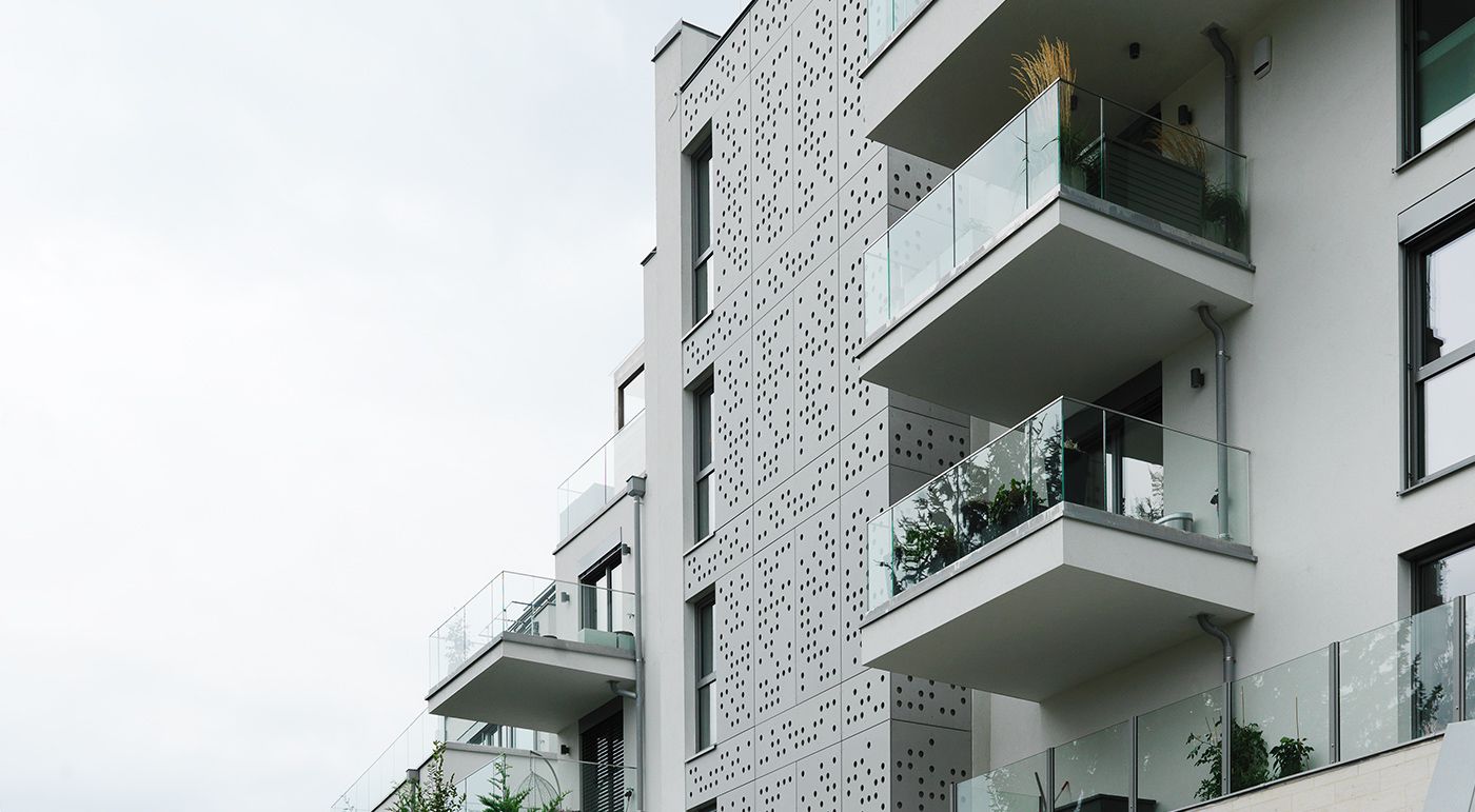 The architects at Buschina & Partner used perforated panels for the facade design of a residential building in a premium location in Vienna. The panels offer an interesting contrast to the otherwise plain building envelope. Small gaps in the large glassfibre reinforced concrete panels afford a partially obstructed view of what lies behind. This creates an attractive interplay between transparency and cladding.