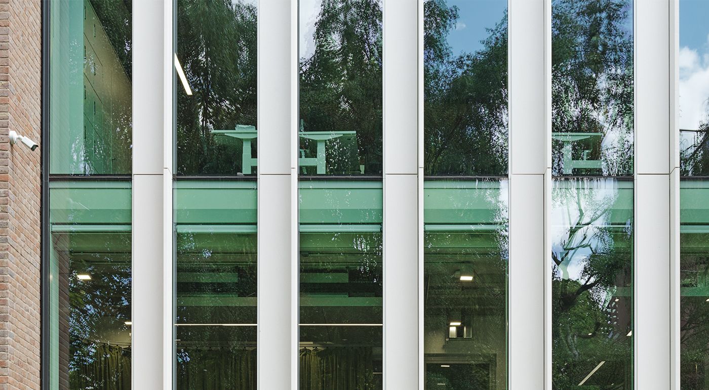 The architects used a clear palette of materials, including wood, glassfibre reinforced concrete, brick, and glass. Vertical brick pillars alternate with large glass areas, giving the headquarters transparency and light. Beige glassfibre reinforced concrete elements from Rieder complete the overall concept. The building has been awarded BREEAM Excellent.