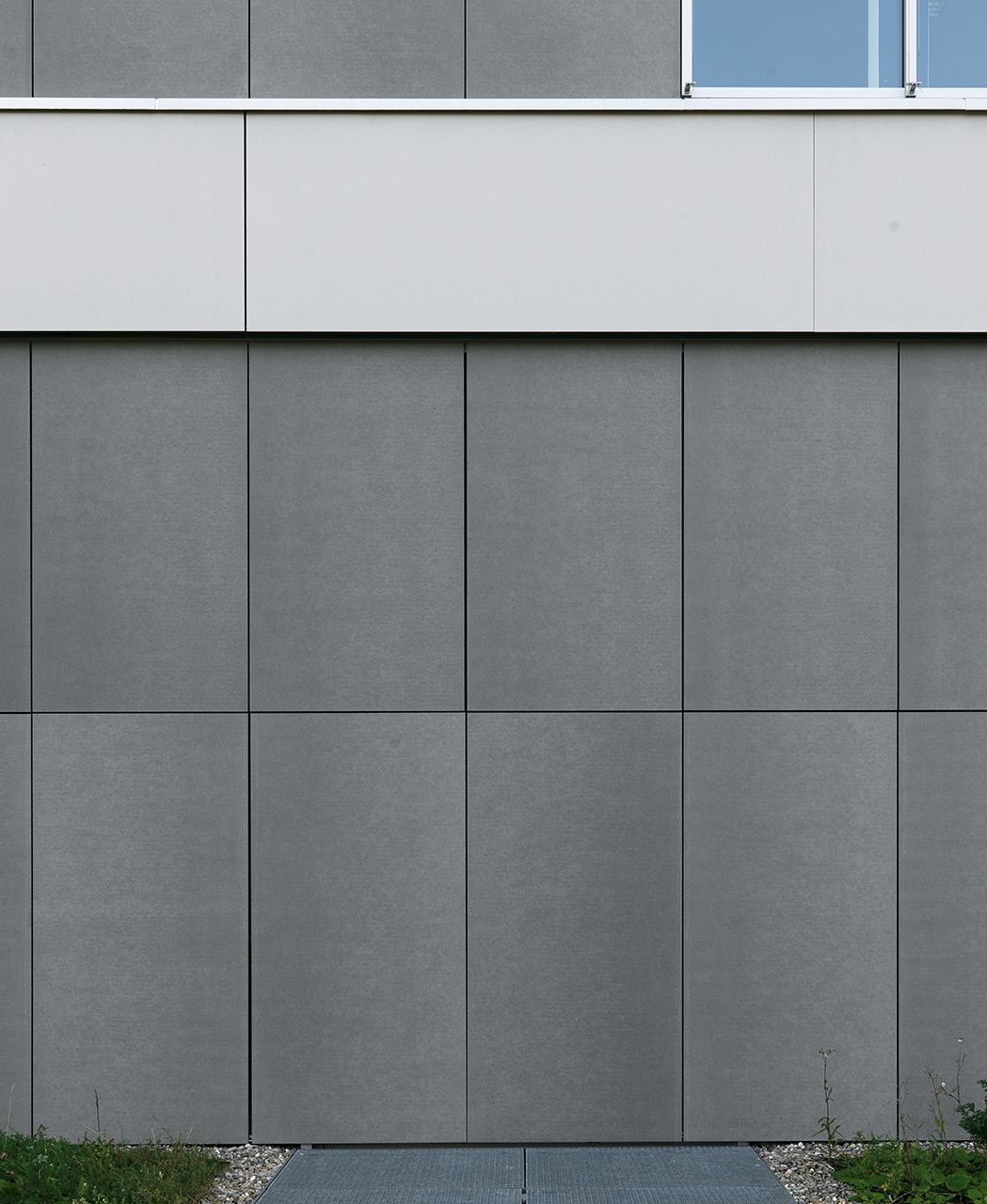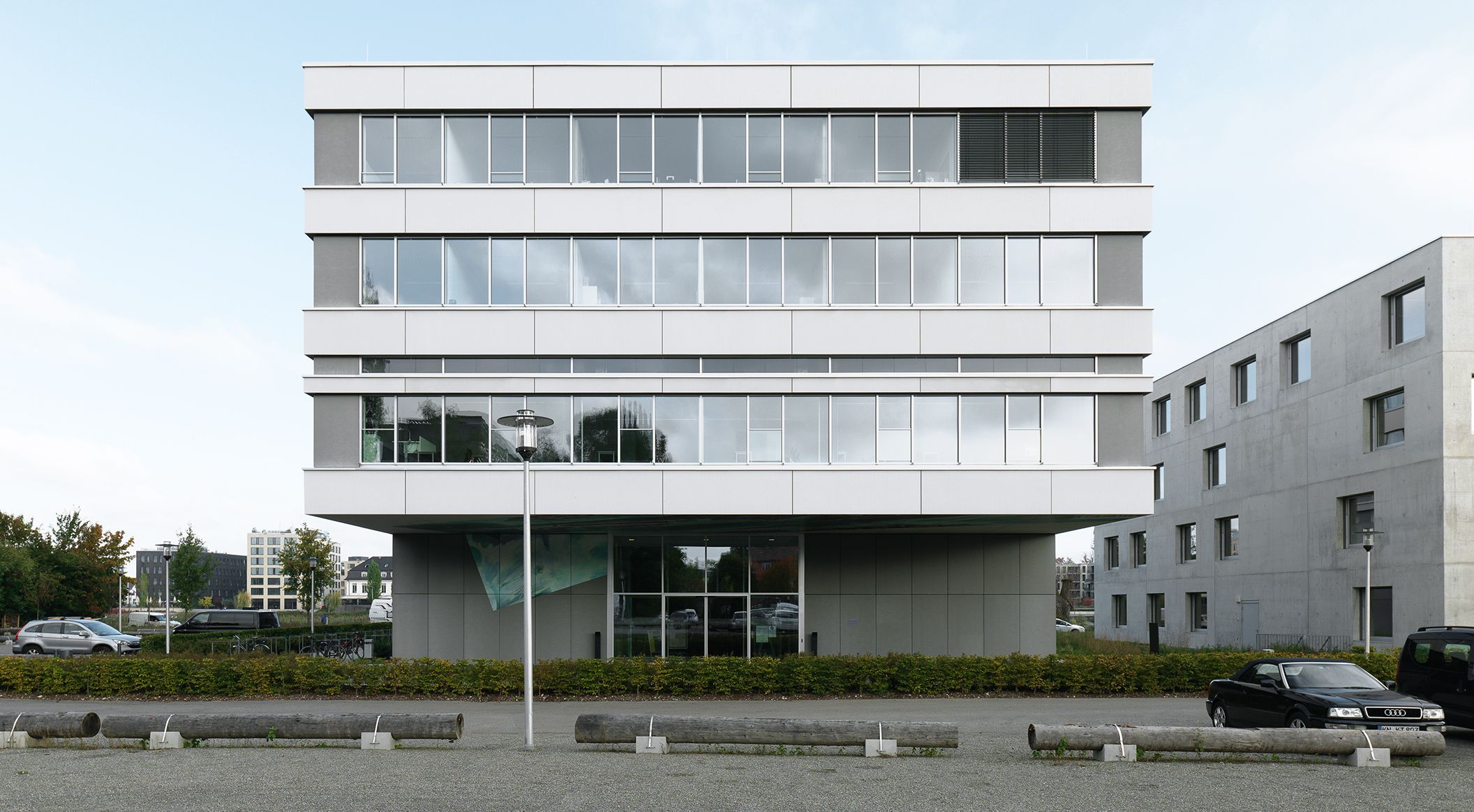 The shell of the building was designed as a strip-structured facade. The suspended concrete skin panels made of glassfiber reinforced concrete reflect the surface and appearance of the exposed concrete of the neighbouring building and create a harmonious connection. The horizontal strips extend across the facade in a light-dark contrast, which creates an exciting visual effect. Individual highlights are yielded through the play of light and shadow. Photos: Ditz Fejer