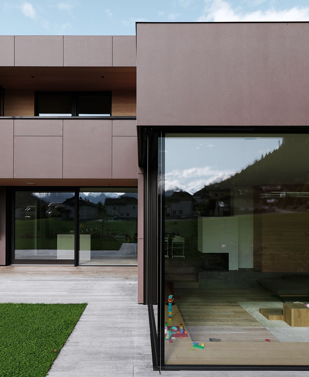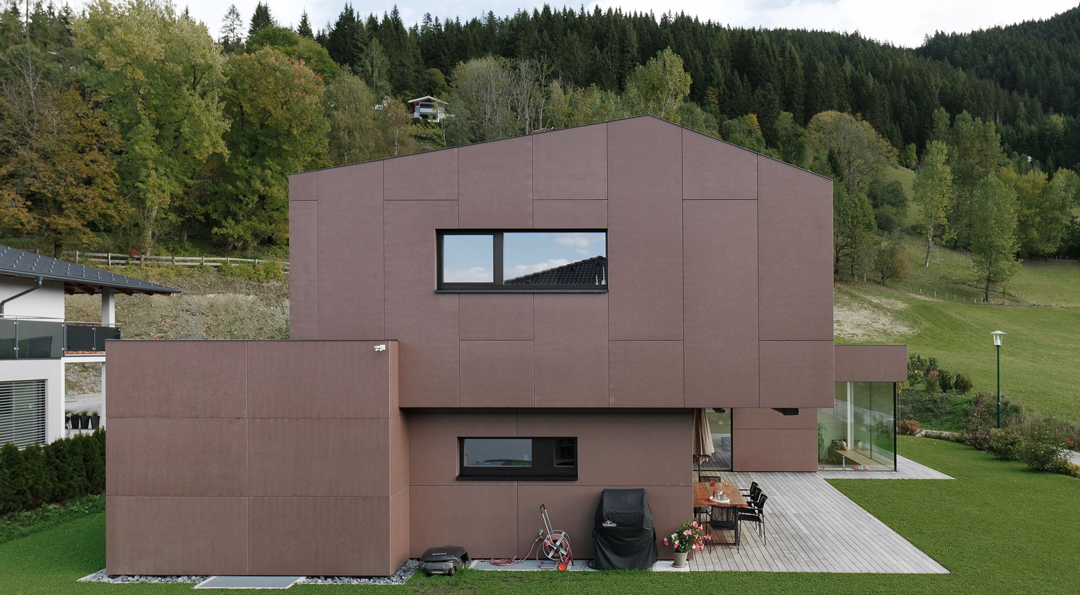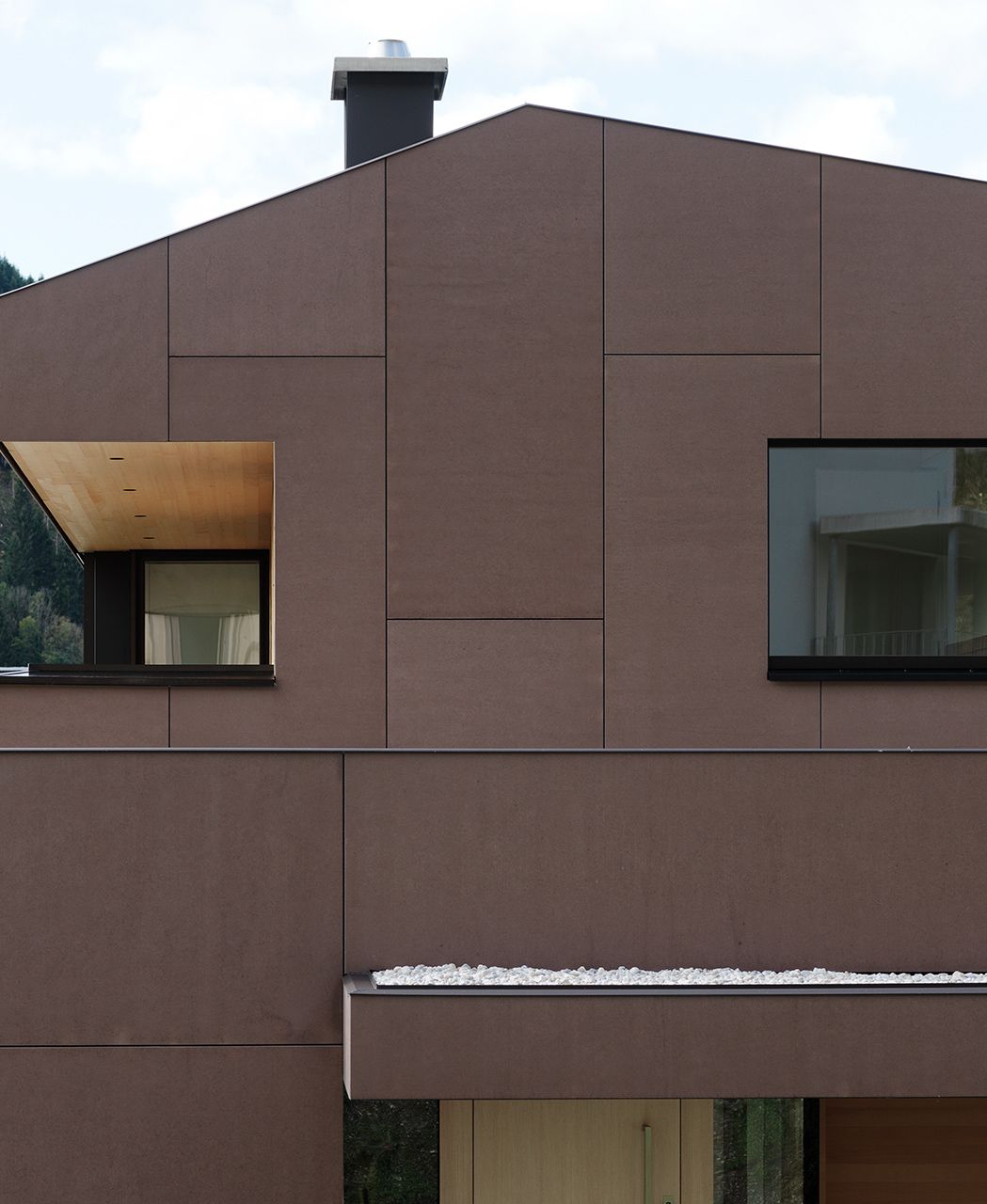 The two-story home was clad with concrete skin panels in the color terra. The natural, warm brown shade ensures that the building blends harmoniously into its surroundings. Photos: Ditz Fejer