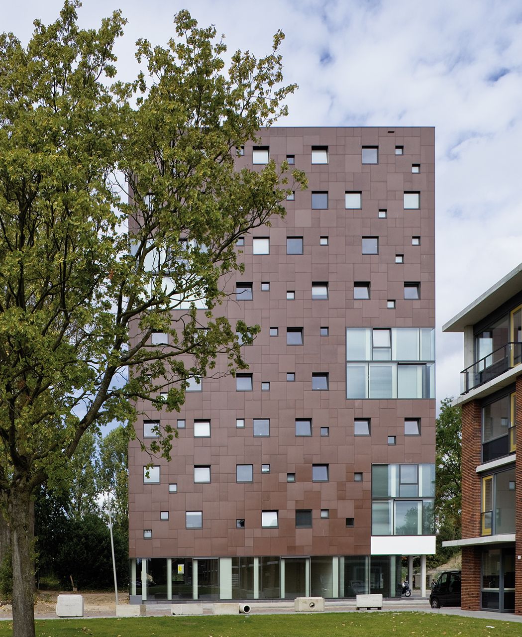 The architects from Group A designed a student residence. “Blok 1” has 9 floors and a communal terrace. For the facade, the architects used different-sized concrete skin panels with different sand-blasted surfaces. The windows were arranged so that every bedroom gets as much daylight as possible. Photos: Daria Scagliola and Stijn Brakkee
