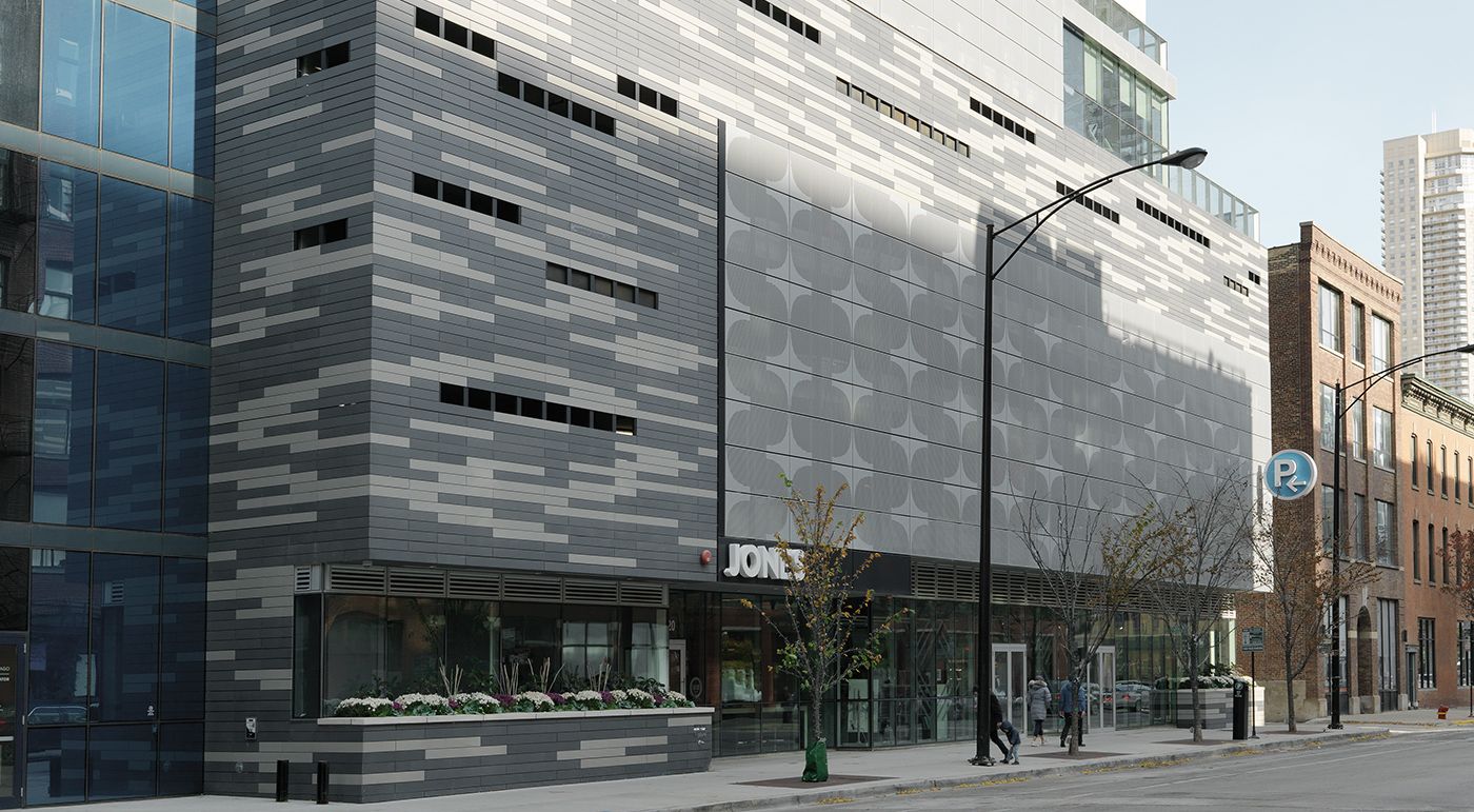 The Jones offers luxury flats and studios near the Magnificent Mile. The facade for the parking deck was designed in the two grey shades, silvergrey and liquid black. Photos: Ditz Fejer