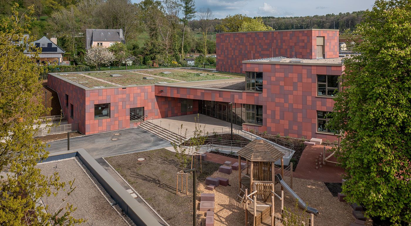 As part of the renovation and expansion of the "Um Bock" School in Differdange, Luxembourg, additional classrooms, a modern library, and new administrative spaces were added.